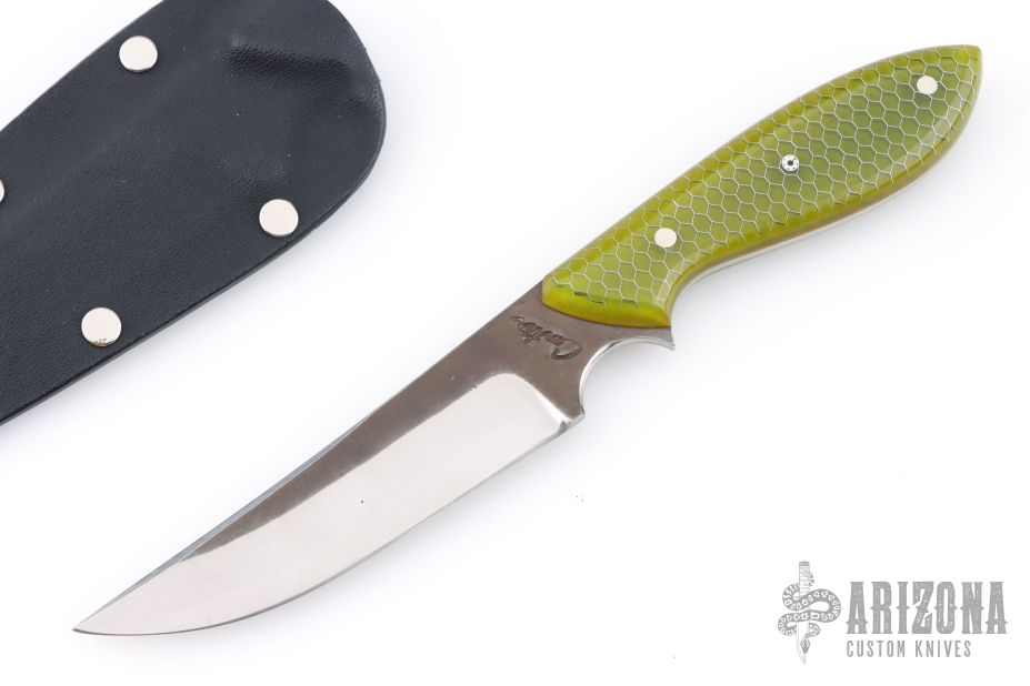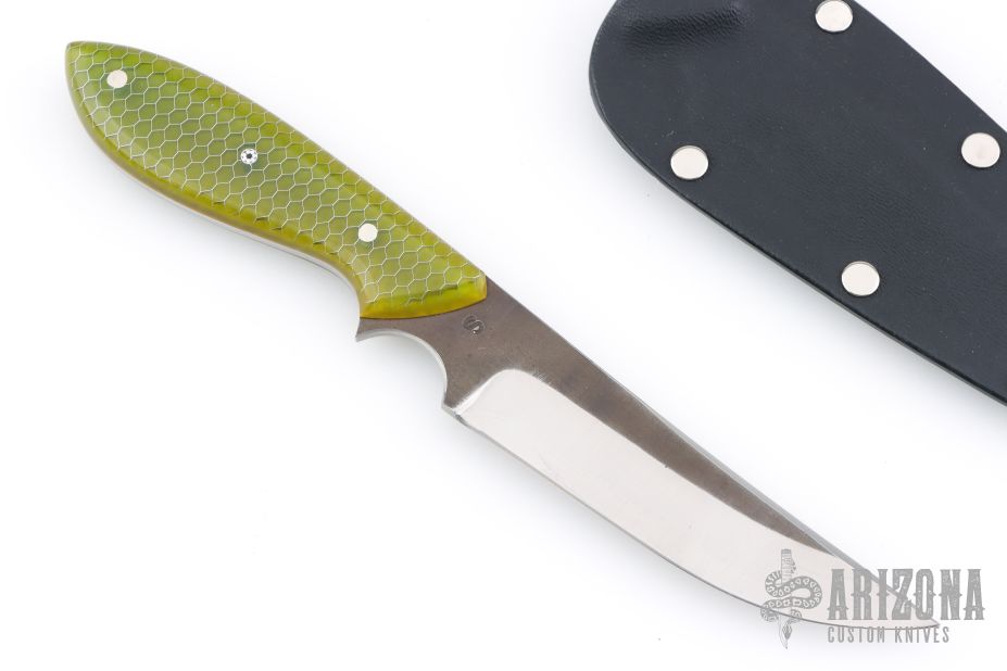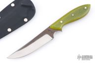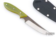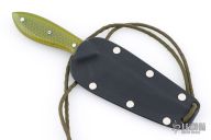 This neck knife by Murray Carter features a hand forged blade with .133" blade thickness and .974" blade depth, full tapered tang construction. The handle has green C-Tek scales with nickel silver and mosaic pins and yellow liners. Comes with kydex neck sheath. Has a few light scratches, otherwise excellent condition.