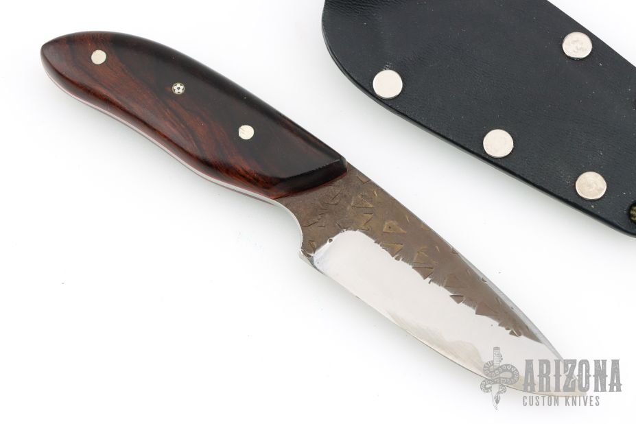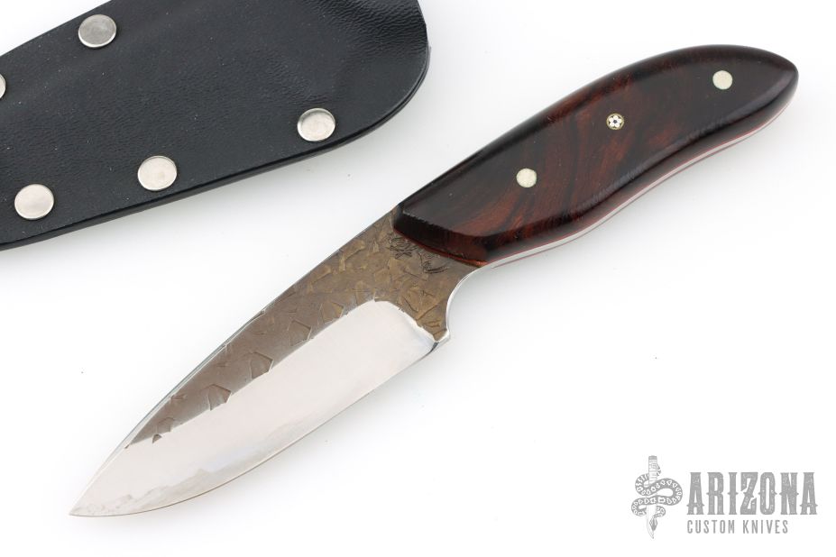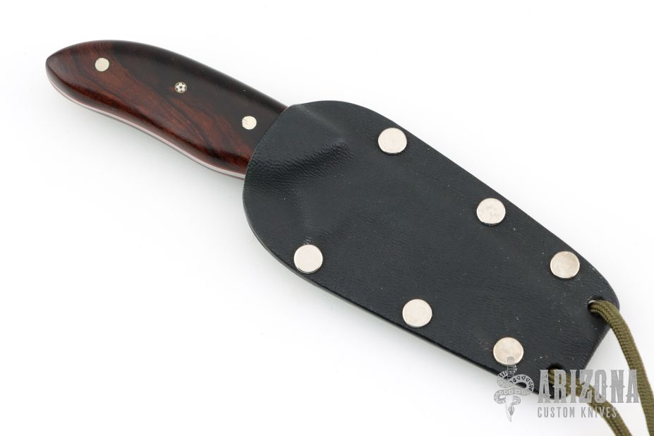 This neck knife by Murray Carter features a hand forged blade with .130" blade thickness and 1.004" blade depth, full tapered tang construction. The handle has ironwood scales with nickel silver and mosaic pins and red liners. Comes with kydex neck sheath. Has a few light scratches, otherwise excellent condition.