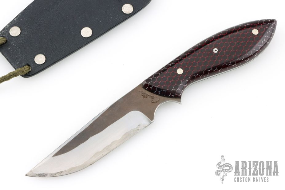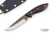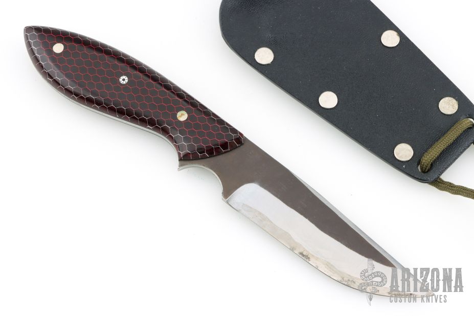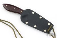 This neck knife by Murray Carter features a hand forged blade with .123" blade thickness and .961" blade depth, full tapered tang construction. The handle has red C-Tek scales with nickel silver and mosaic pins and black liners. Comes with kydex neck sheath. Has a few light scratches and small oxidation spots, otherwise good condition.