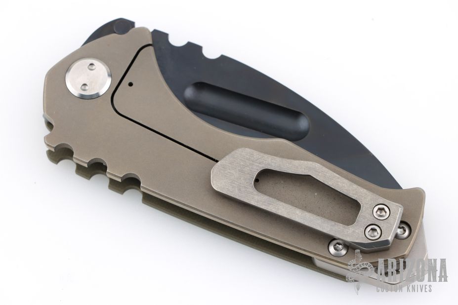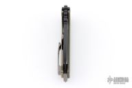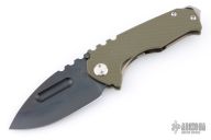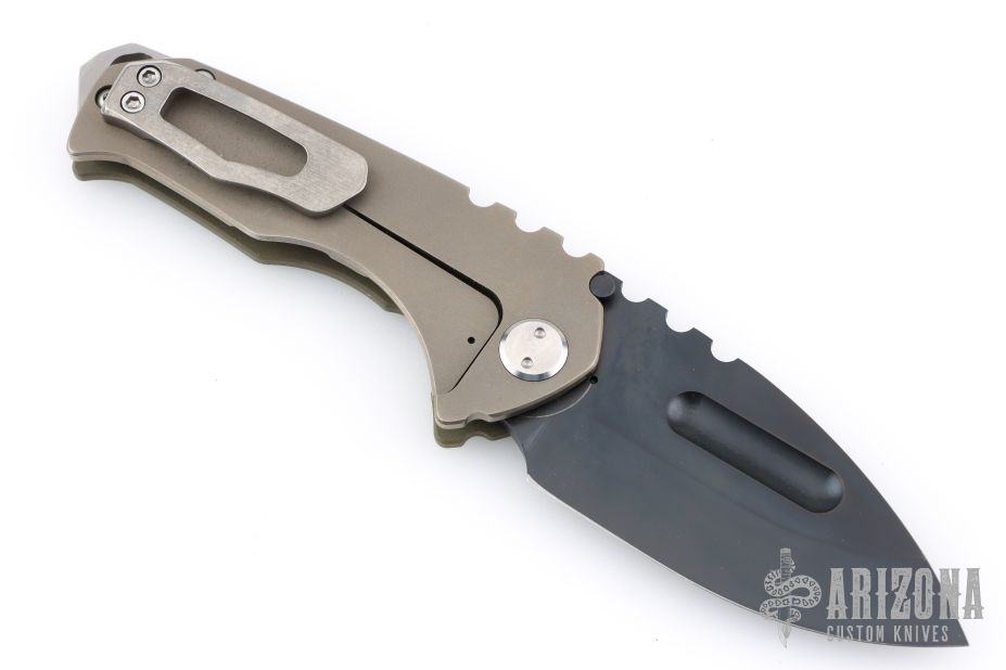 This Praetorian Genesis from Medford Knife and Tool features a black PVD coated drop point blade with fullers and notched thumbrest. The handle has a green G10 "A" side and an anodized and tumbled titanium lockside over a steel backspacer. Flame finished titanium tip up clip. Includes original padded vault style case and paperwork dated July 06, 2017. Excellent condition.