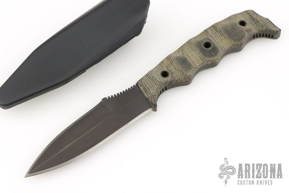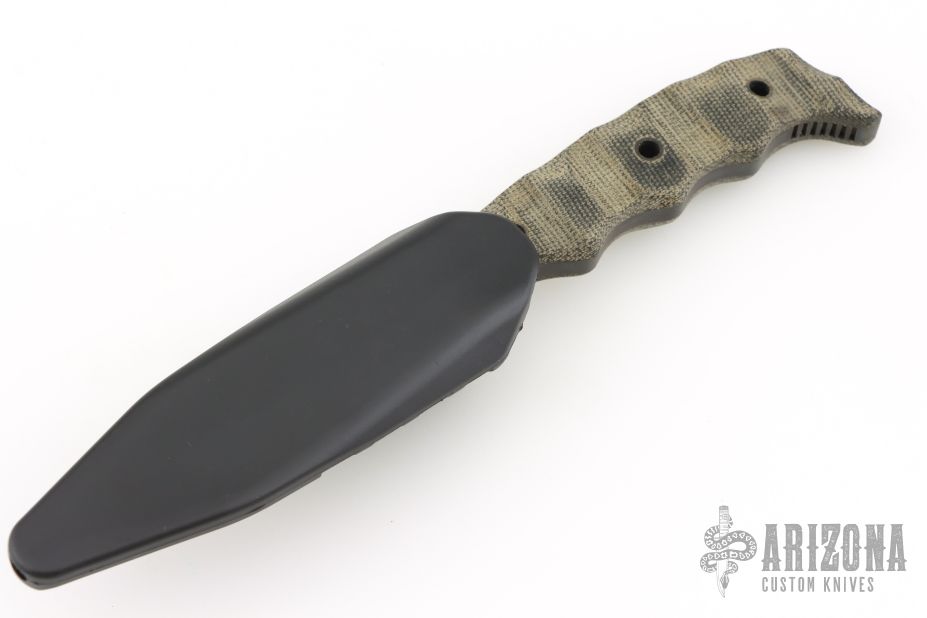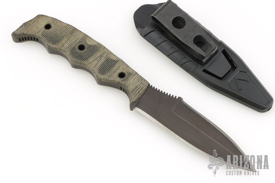 This Dynamis Alliance fixed blade was crafted by Daniel Winkler. IT features a spear point blade with false top edge and notched thumbrest. The handle has canvas micarta scales over full tang construction. Jimping on pommel provides purchase when holding in the reverse grip. Includes a molded plastic sheath with metal clip. Includes original box and papers. Excellent Condition.