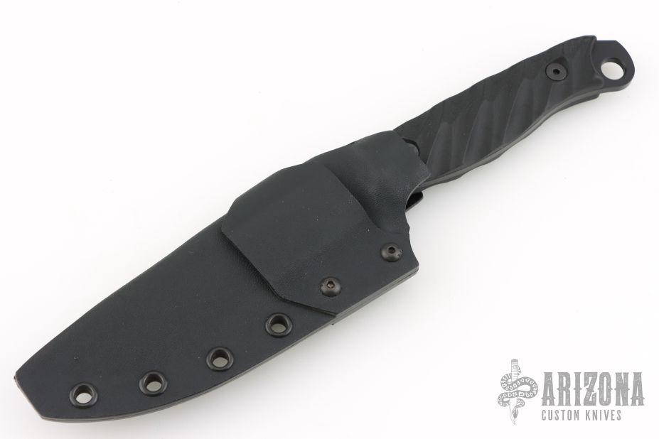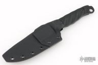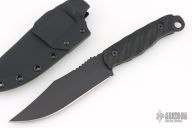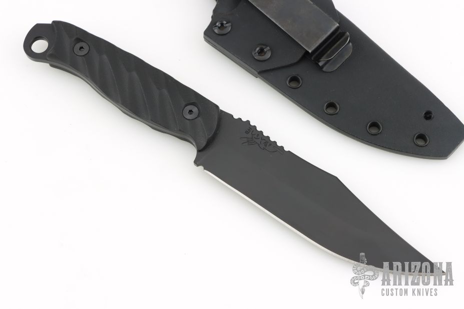 This Crow Scout by Half Face Blades features a cerakote finish blade with notched thumb ramp, .146" blade stock, 1.426" blade depth, full tang construction. The handle has sculpted G-10 scales. Comes with kydex sheath. Excellent condition.
