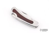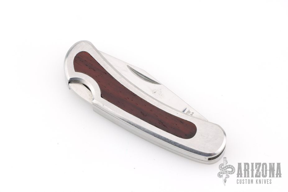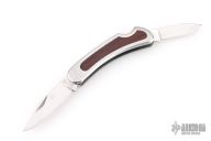 This vintage lockback by Kershaw features a satin finished blade with nail nick. The handle has stainless steel frame, with steel covers, spring, and wood inlays. The scales are rosewood. Has some scratches, otherwise good condition. Comes with Kershaw box.