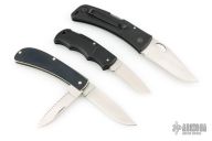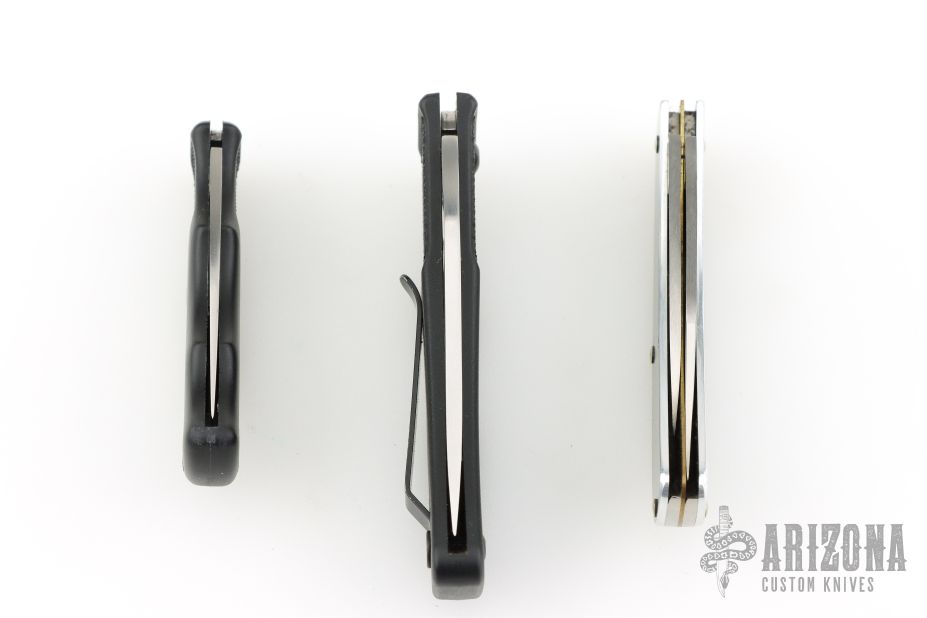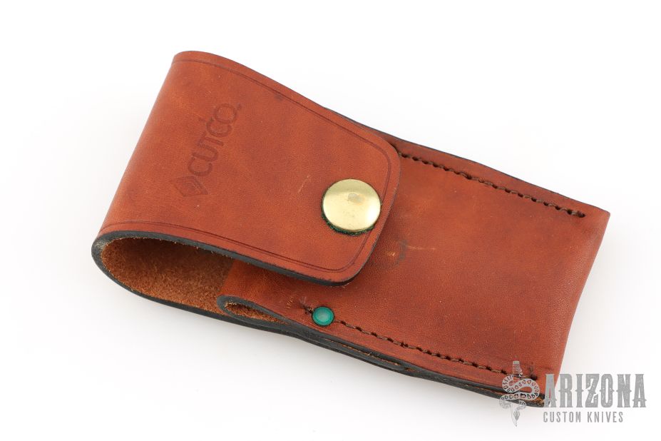 This slipjoint by Cutco features satin finished blades with nail nicks, one blade is fully serrated. The handle has black aluminum covers, brass center liner, stainless steel springs. Has a couple light scratches, otherwise excellent condition. Comes with original brown leather sheath and box.