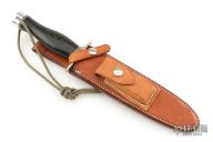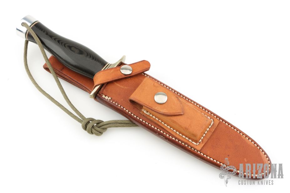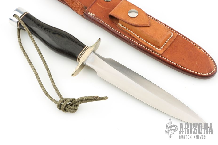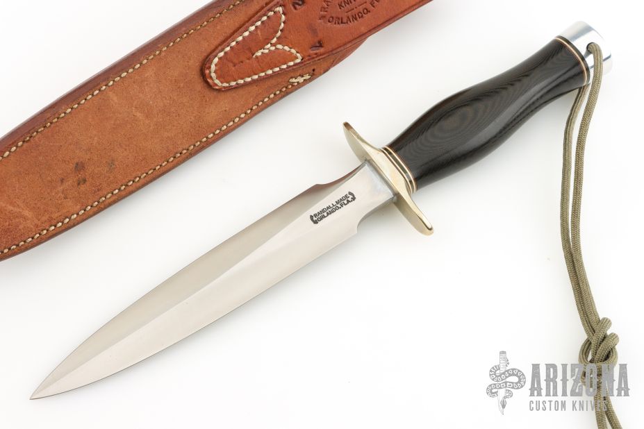 This Model 2-7 by Randall Made knives features a satin finished double edged blade, .233" blade thickness and 1.237" blade depth, hidden tang construction. The Model 2 is a heavily made dagger or dirk. Nickel silver guard and duralumin butt with lanyard hole, black linen micarta grip with red/white/blue spacers. Comes with a Johnson Roughback brown leather sheath. Excellent condition.