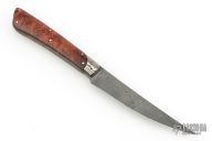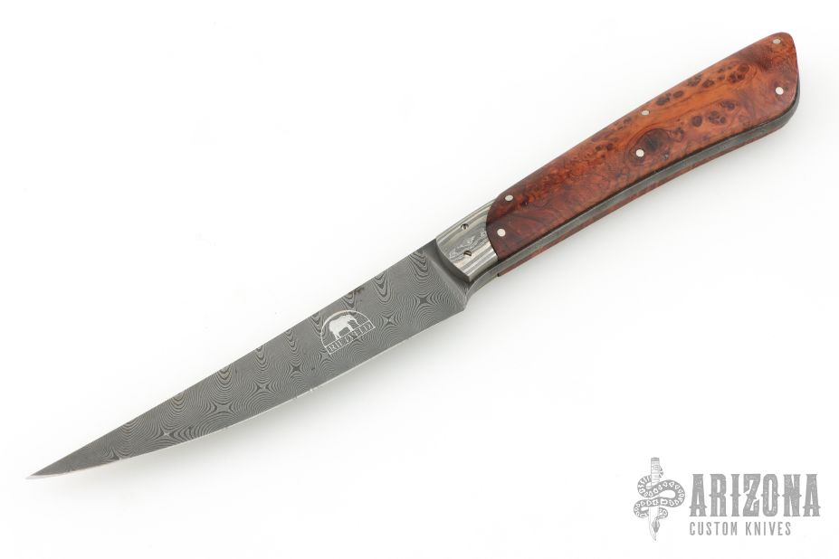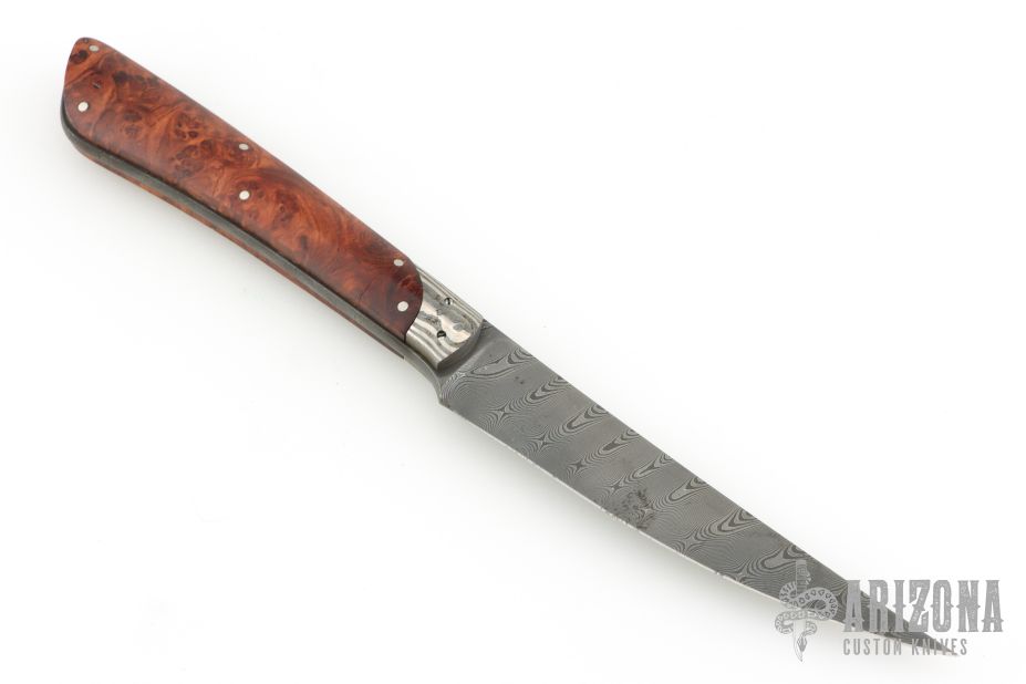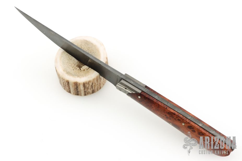 This Knife by Bertie Rietveld features his a Damascus blade with .154" blade stock and .795" blade depth, full tang construction with rounded tang. The handle has Damascus bolsters, burl wood scales with stainless steel pins. This knife was pre Stanhope Lens, the makers mark is on the blade. Has a couple light scuffs and a few light spots on the blade, otherwise excellent condition.