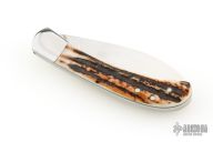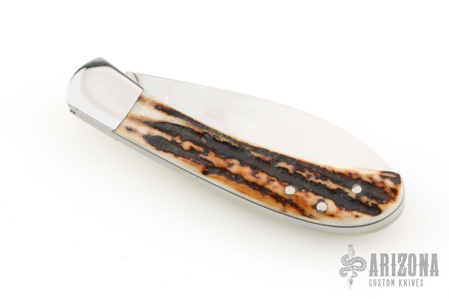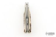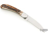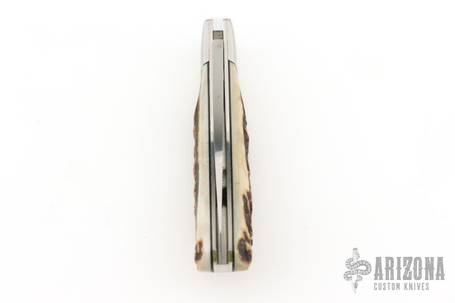 This Slipjoint by Joe Prince features a mirror polished blade with nail nick. The handle has dovetailed stainless steel bolsters and liners, stag scales with black liners and a stainless steel spring. Nice blade seating and lockup. Has half-stop, flush in all positions. Has a few light scratches, otherwise excellent condition.
