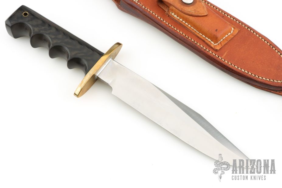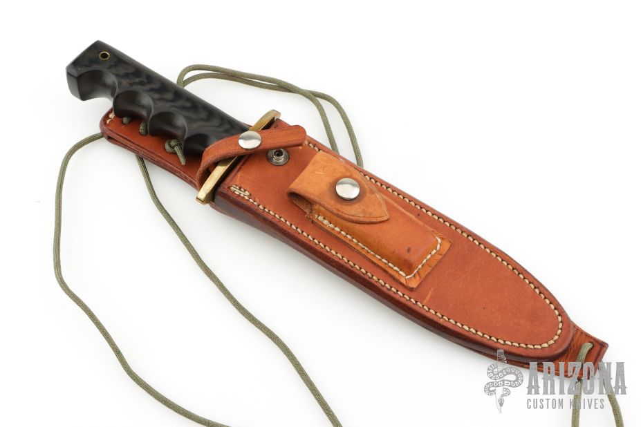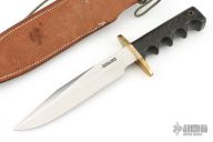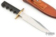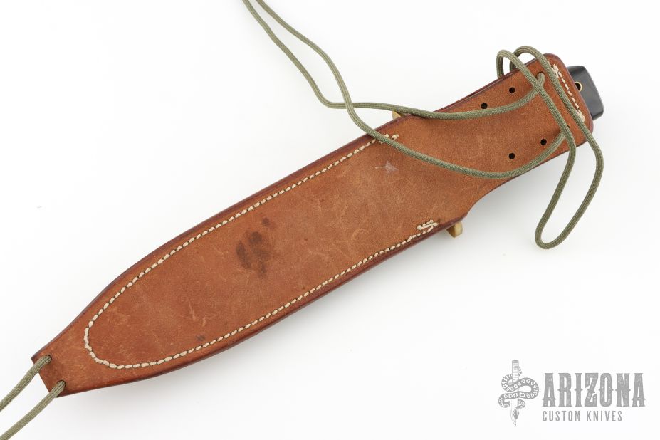 This Model 14 from Randall Made Knives features a satin finished blade with sharpened top edge, .223" blade stock and 1.377" blade depth, full tang construction. The handle is comprised of a brass guard and black linen micarta handle with finger grooves. Comes with a rough back brown leather sheath. Has a couple light spots on the blade, otherwise excellent condition.