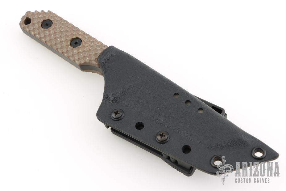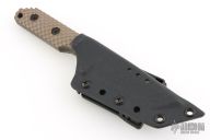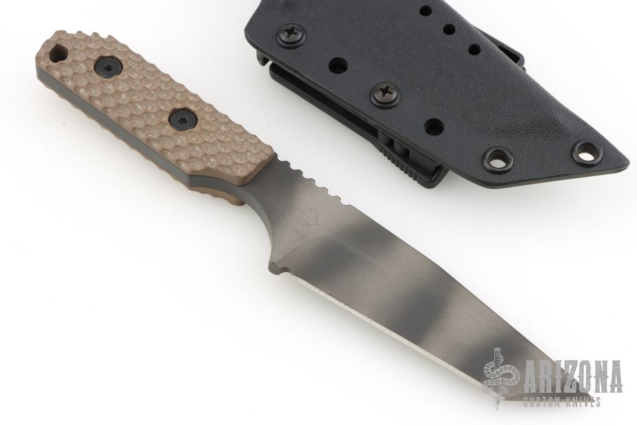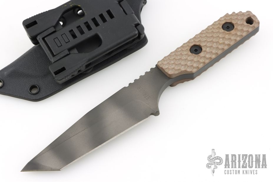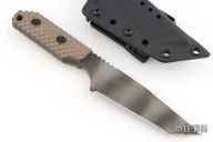This DB-L from Strider Knives features a tanto blade with tiger stripe finish and notched thumbrest, .247" blade stock and 1.239" blade depth, full tang construction. The handle has a brown G-10 gunner grip scales. Comes with a Kydex sheath. Excellent condition.