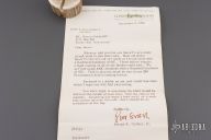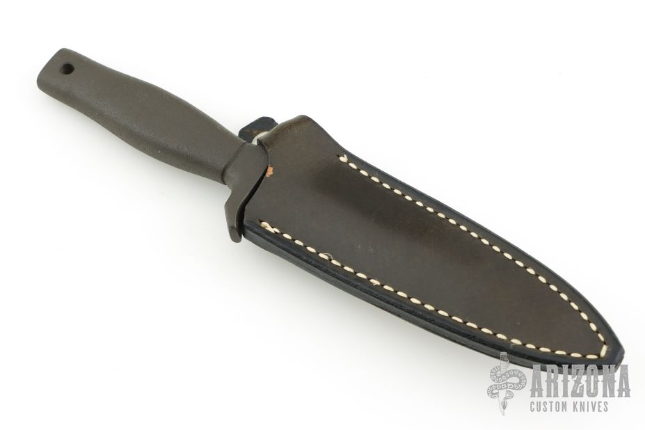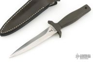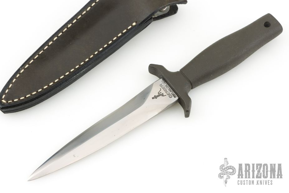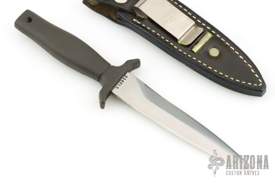 This Mark 1 dagger by Gerber is double-edged and hand rub satin finished, .235" blade stock and .938" blade depth, hidden tang construction. Black coated aluminum handle. Comes with black leather sheath with boot clip. #014015. Has some light oxidation spots, otherwise excellent condition. Comes with original box, papers and a letter from Peter Gerber dated Dec 2, 1980.