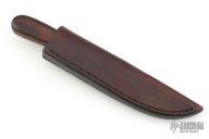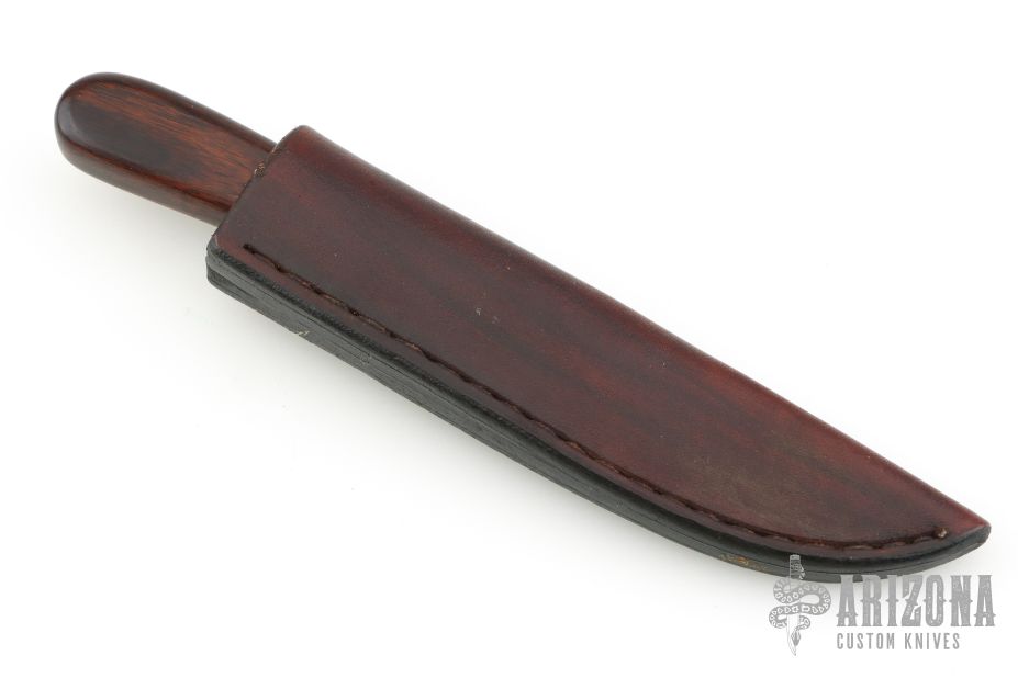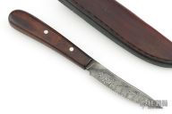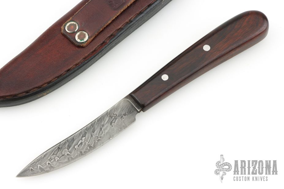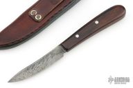 This Bird Knife from Wayne Goddard features a Cable Damascus blade with .134" blade stock and .652" blade depth, hidden tang construction. The handle is ironwood with stainless steel pins. Includes a brown leather sheath with belt loop. Excellent condition.