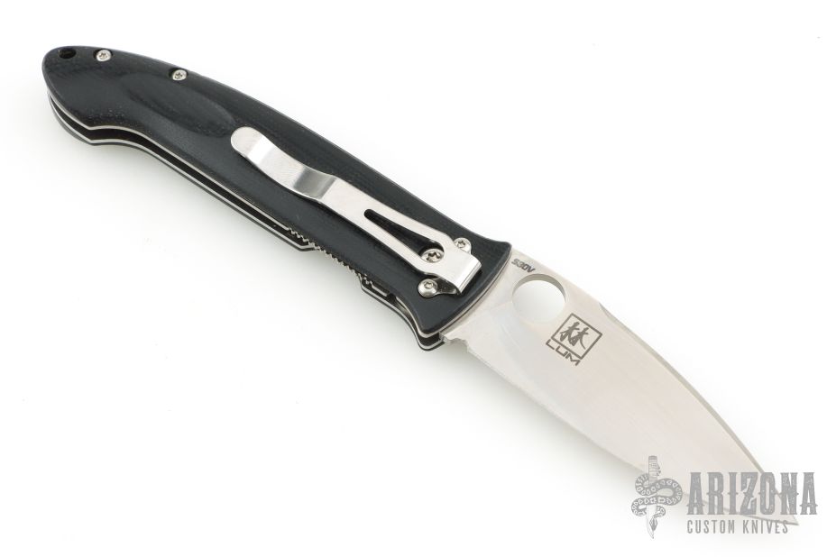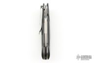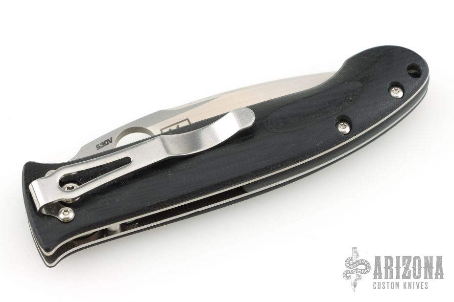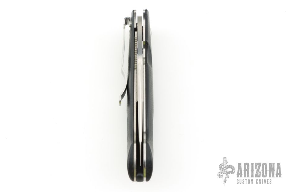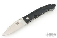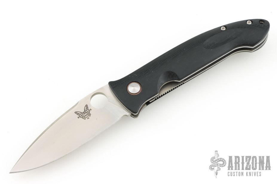 This Mini-Dejavoo by Benchmade features a satin finished drop point blade with false top edge and thumbhole. The handle has black G-10 scales, stainless steel and titanium liners, and a black FRN backspacer, tip down black stainless steel clip. Has some light scratches, excellent condition otherwise.