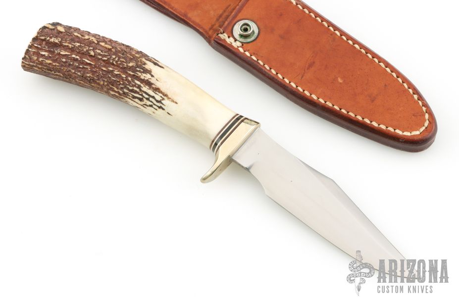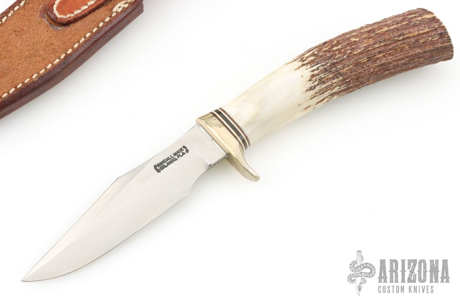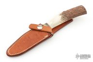 This Model 8-4 by Randall Made Knives features a satin finished blade with sharpened top edge, .153" blade thickness, .987" blade depth, hidden tang construction. Especially suitable for small fish and feathered game. The handle has a nickel silver guard and stag grip with red/white/blue spacers. Comes with a rough back brown leather sheath. Excellent condition.