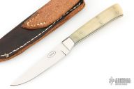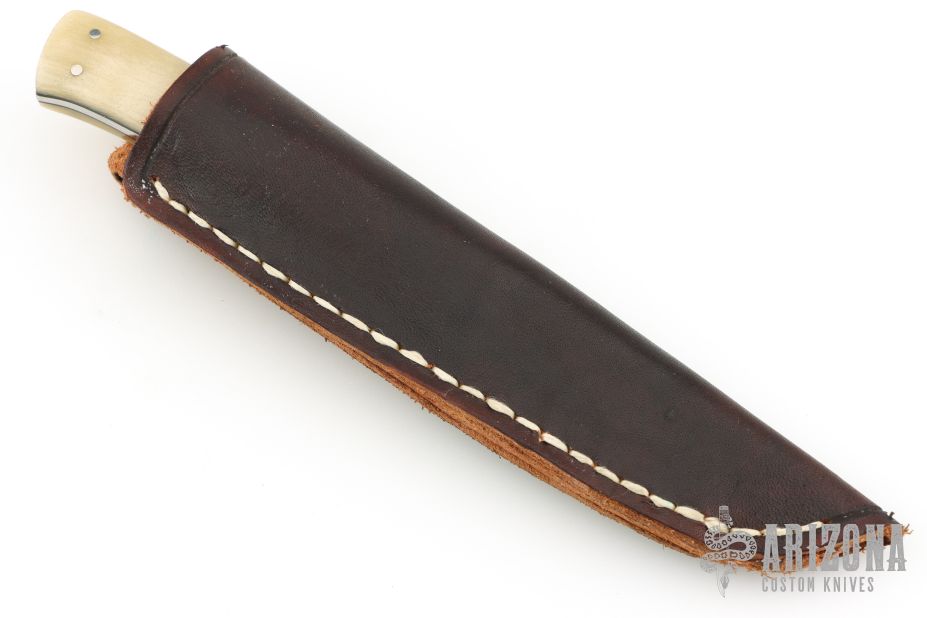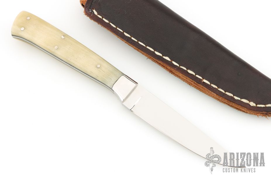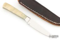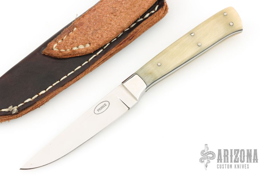 This knife by Joe Prince features a mirror polished blade with .144" blade stock and .726" blade depth, full tapered tang construction. The handle has dovetailed nickel silver bolsters, sheep horn scales with black liners and nickel silver pins. Comes with a brown leather sheath. Excellent condition.