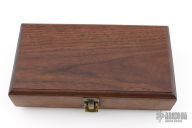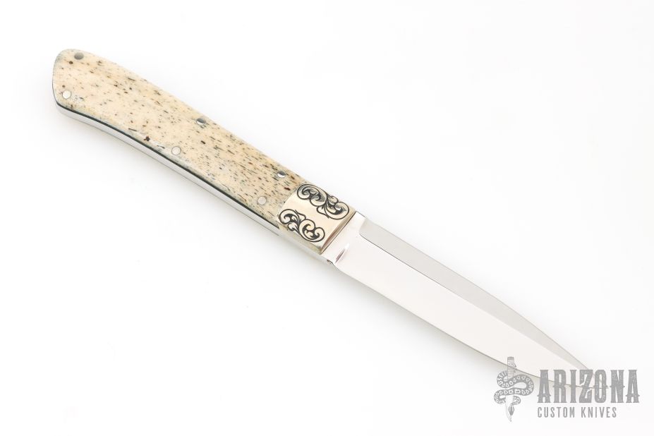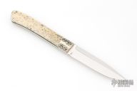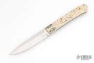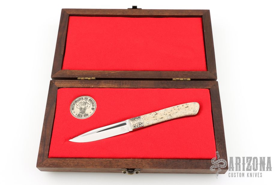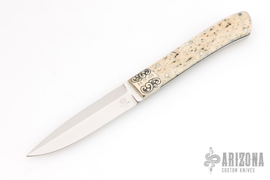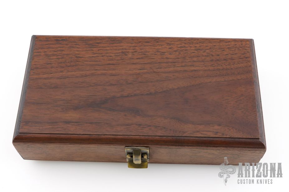 This Boot Knife by Lee Bench Made Knives features a mirror polished blade with a sharpened top edge, .119" blade stock and .697" blade depth, full tang construction. The handle has engraved nickel silver dovetailed bolsters, oosic scales with black liners. Comes with a wooden presentation box and coin. Excellent condition.
