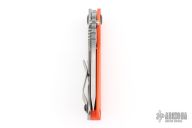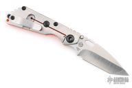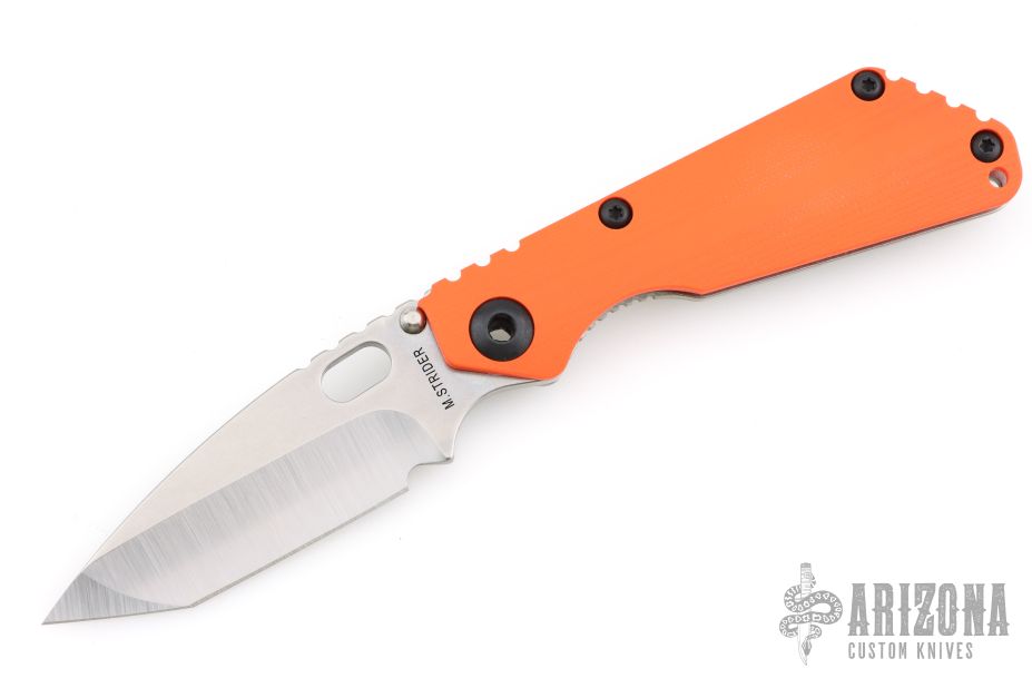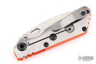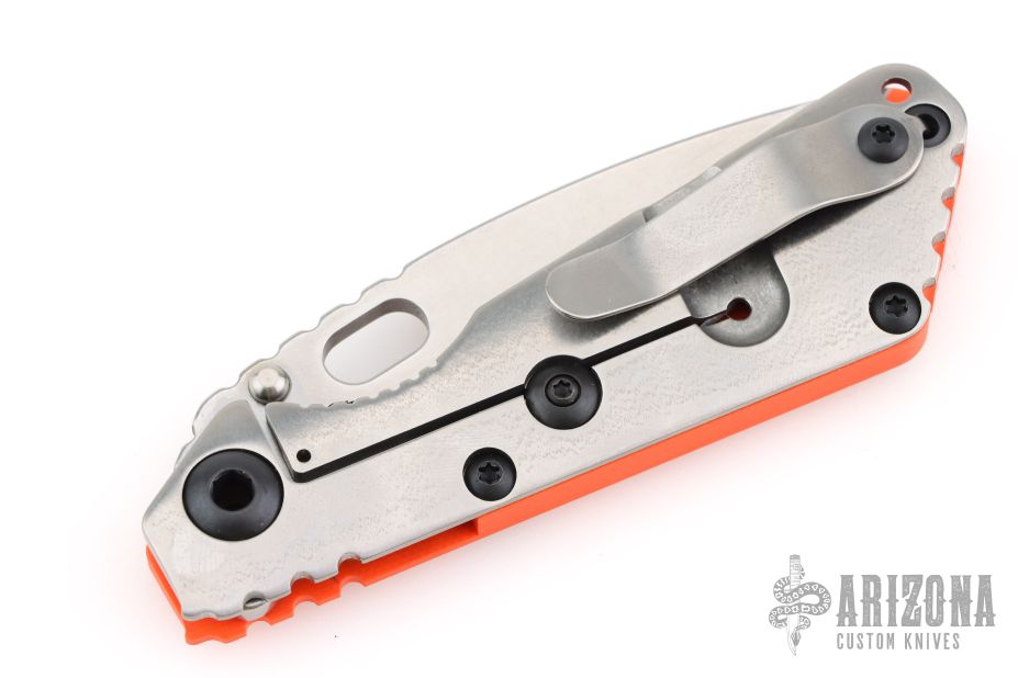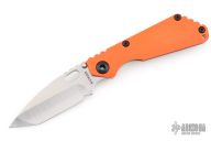This Mick Strider Performance series SNG framelock folder features a stonewashed tanto blade with thumbhole and notched thumbrest. The handle has an orange G-10 and orange peel finished titanium frame with titanium clip, tip up carry. Jimping on blade spine. Includes Hinderer "Lock Bar Stabilizer" for maximum reverse lock retention. Nice lockup, detent, and blade seating. Excellent condition.