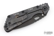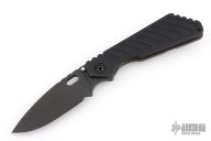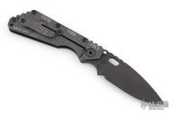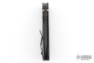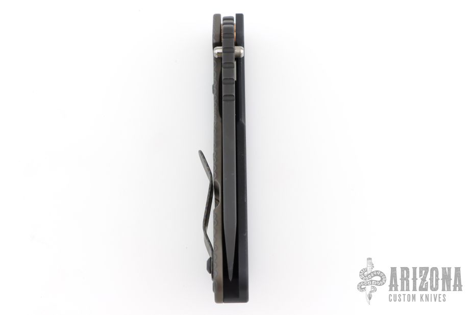This Mick Strider SMF framelock folder features a black blade with thumbhole and notched thumbrest. The handle has a black aluminum and flamed titanium frame with titanium clip, tip up carry. Jimping on blade spine. Nice lockup, detent, and blade seating. Excellent condition.
