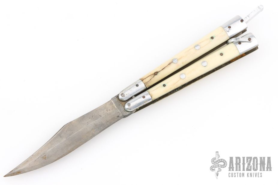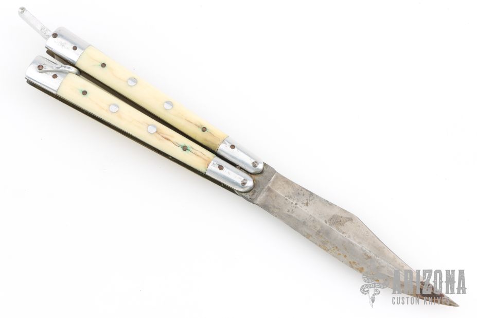 This balisong from the Philippines features a clip point blade with a satin finish. The handle has aluminum bolsters, front and rear and white bone scales, aluminum T-latch and brass liners/frame. Has scratches and oxidation, has some cracks in the scales, fair condition for its age.