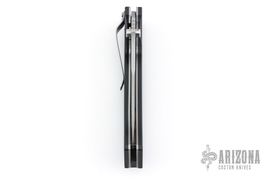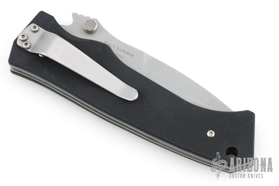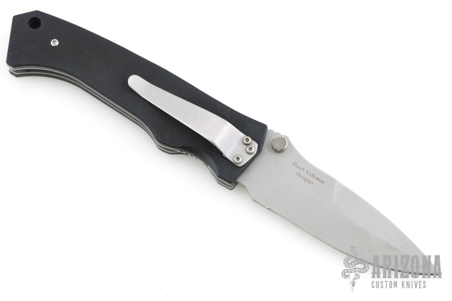 This is a scale release D/A linerlock by Lone Wolf Kninves features a bead blast blade with false top edge, notched thumbrest and dual thumbstuds. The handle has black G-10 scales, stainless steel liners and backspacer with a tip down bead blasted titanium clip. Has some light scuffs and scratches, otherwise good condition. This knife is Pre-Benchmade.