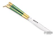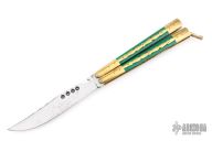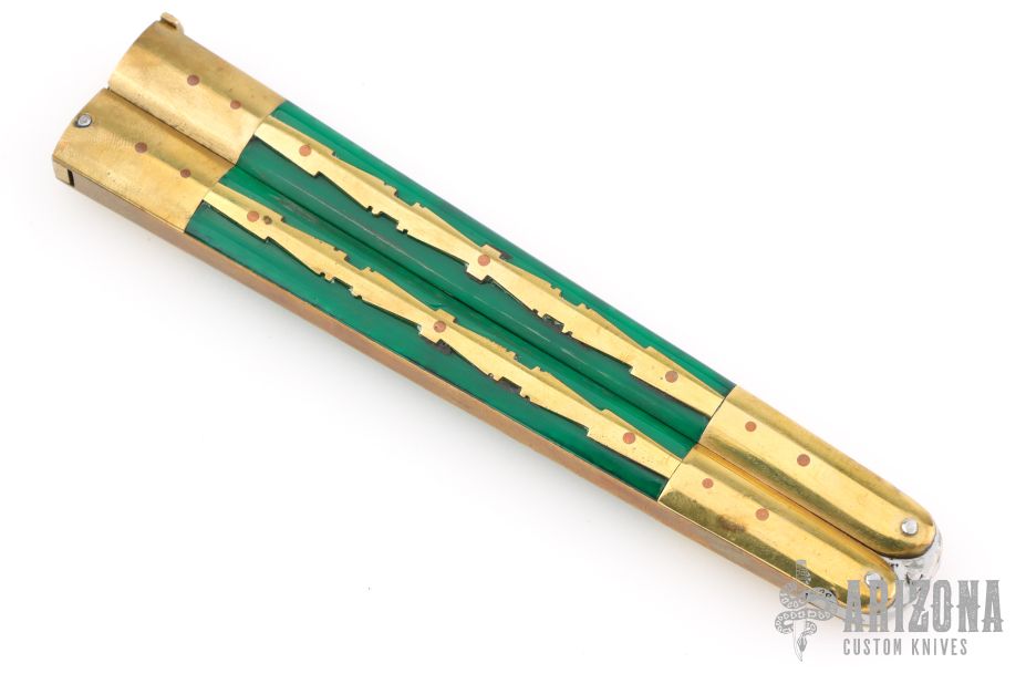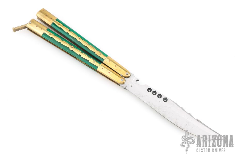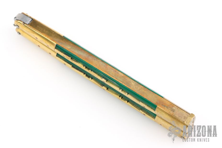 This balisong from the Philippines features a satin finished blade with holes, and fileworked spine. The handle has brass bolsters and channel/liners, green acrylic scales with brass overlays, brass T-latch. Has some scratches and patina, otherwise good condition.