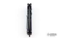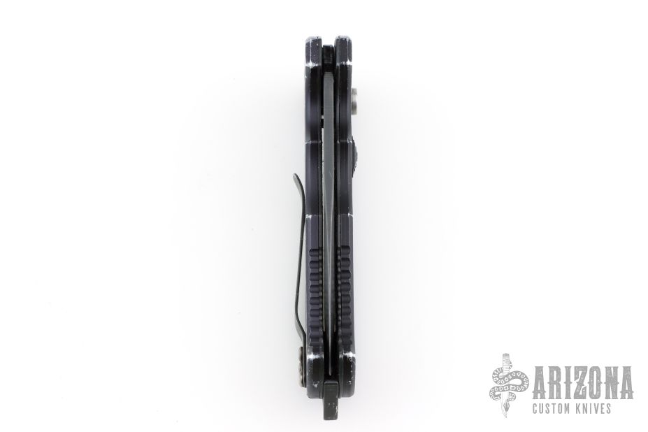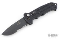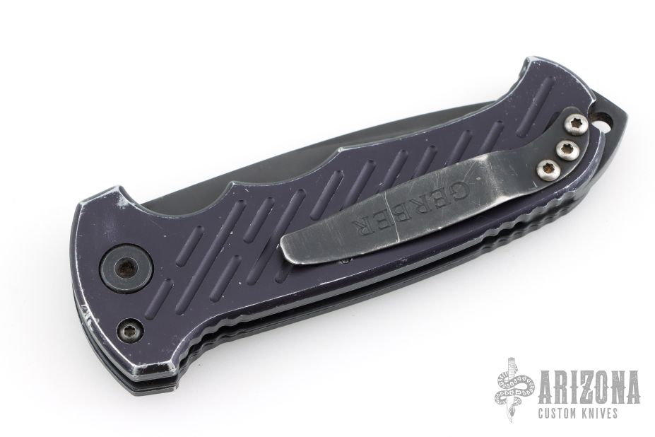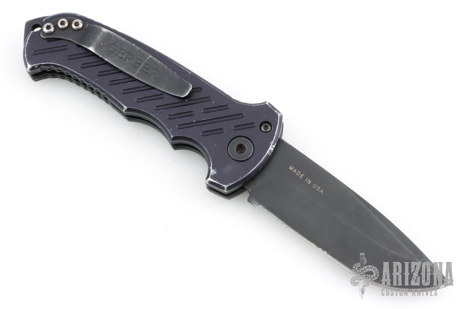 This 06 Side Opening Auto has a matte black finished S30V drop point blade with partial serrations. The handle is black aluminum over black stainless steel liners, exposed stainless steel tang butt/ glass breaker/ backspacer with lanyard hole, black stainless steel tip up (RH/LH reversible) clip, and safety button. Has scratches and scuffs, has wear on the frame, needs sharpening, otherwise good user condition.