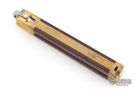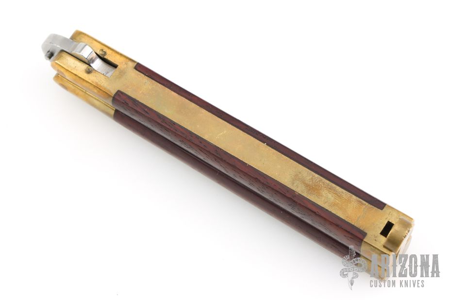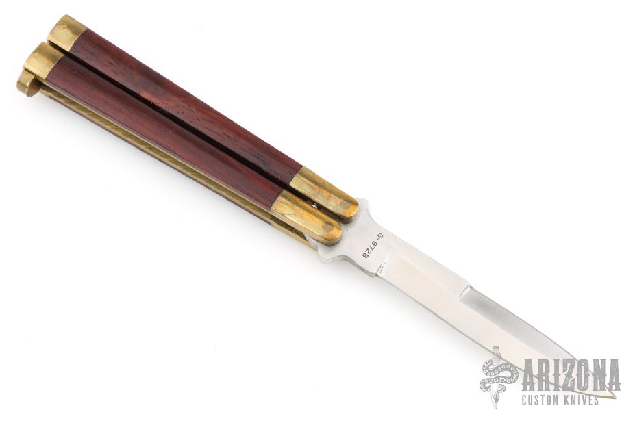 This Manilla Folder Balisong from Taylor/Seto features a satin finished spear point blade with a sharpened top edge. The handle has an integral brass construction with rosewood inlays. T latch on pommel. Has some light scratches and patina, otherwise good condition.