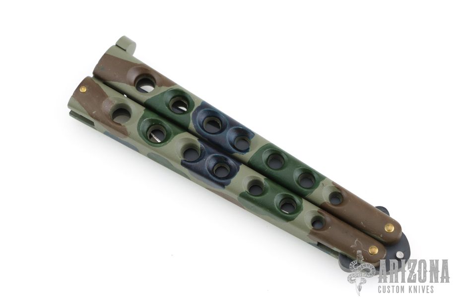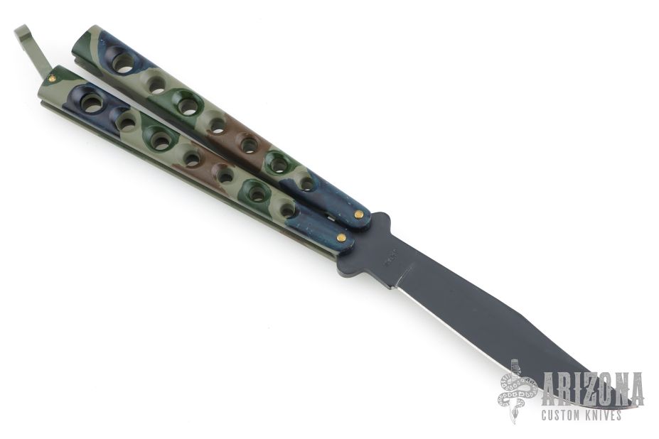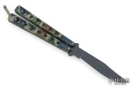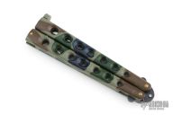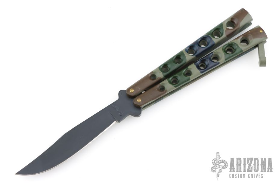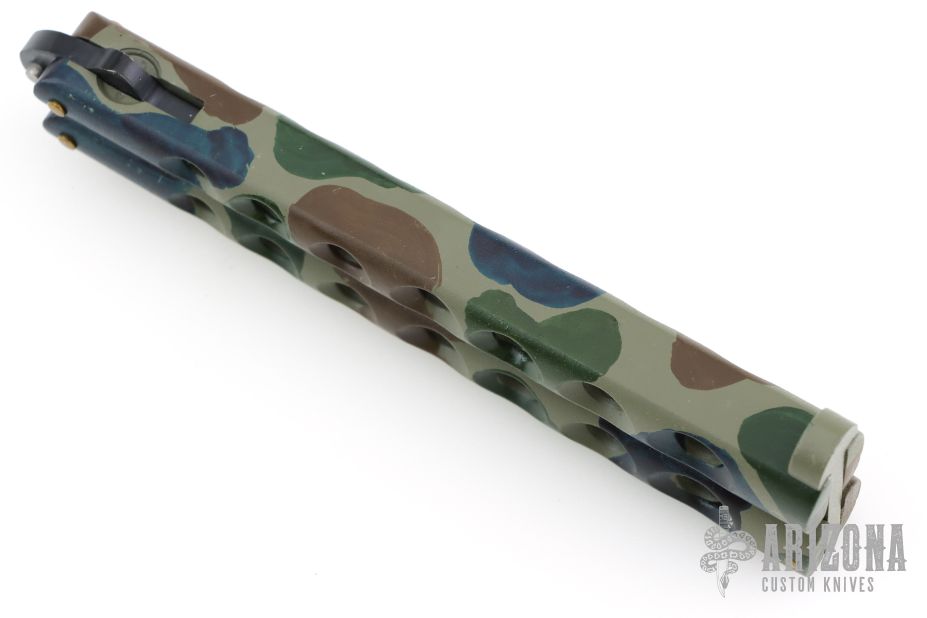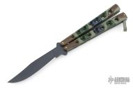 This Bali-Song by Al Mar and Mil-Tech features a black coated blade. The handles are camo coated channel construction with a matching T-latch. Has some light scuffs, otherwise excellent condition.