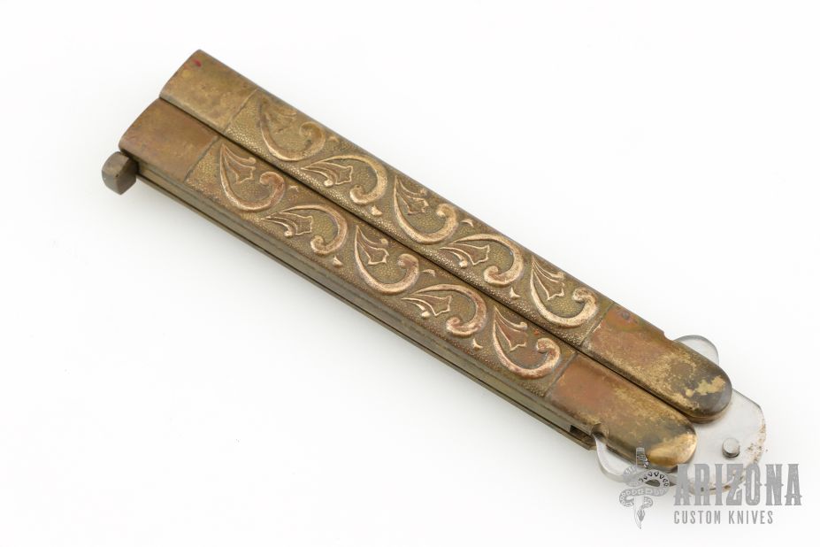 This Balisong by Parker Cutlery Company features a satin finished blade. The handles have stamped brass scales with brass channel construction liners and a brass t-latch. Has scratches and patina, otherwise good condition.