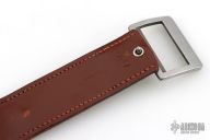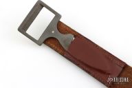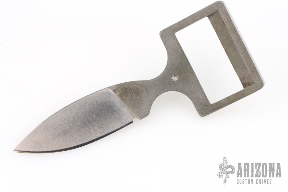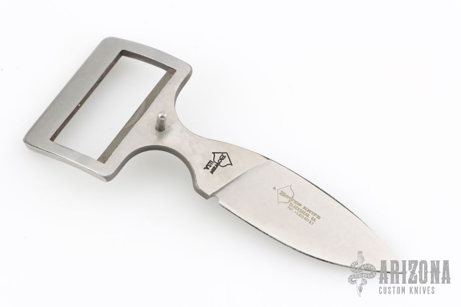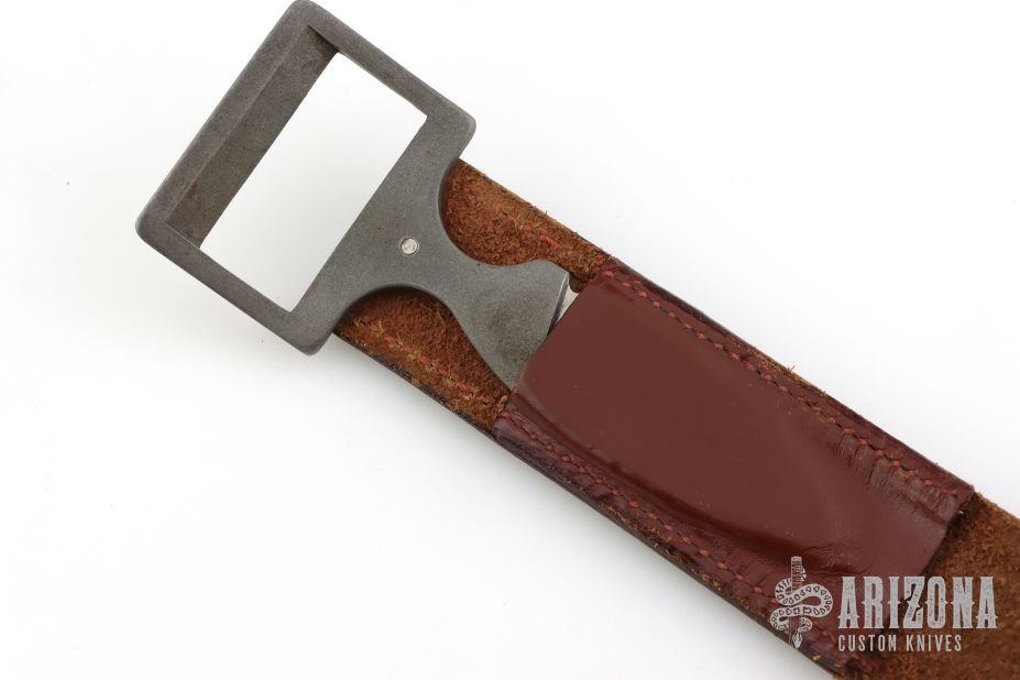 This is a belt buckle knife by Bowen USA. Has a drop point blade, .167" blade stock and .978" blade depth, integral construction. Comes with a brown leather 30" belt. Has a few light scuffs, otherwise excellent condition.