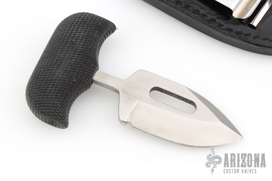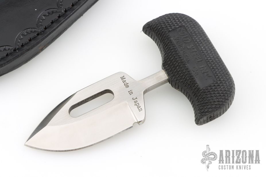 This "Urban Skinner" Push Dagger by Cold Steel has a satin finished spear point blade with a sharpened top edge, hidden tang, .185" blade stock, 1.296" depth. Handle is non-slip polymer. Has a couple very light scratches, otherwise excellent condition. Comes with original box, papers and black leather sheath with clip.