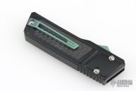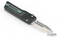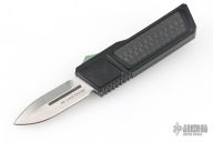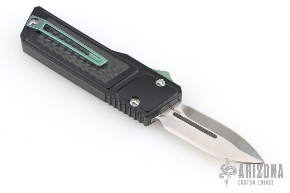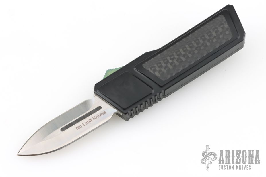 This Akuma OTF Auto by No Limit Knives features a satin finished double-edged blade with carbon fiber inlays. The handle has a black aluminum frame with carbon fiber inlays and a steel pocket clip. Comes with a zippered case. Excellent Condition.