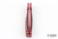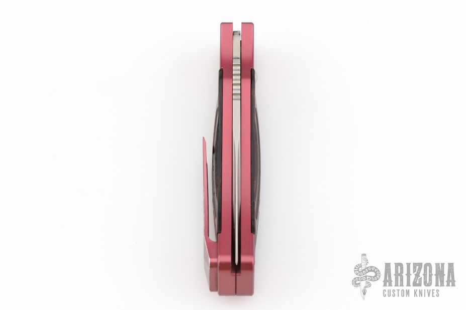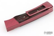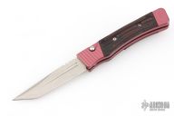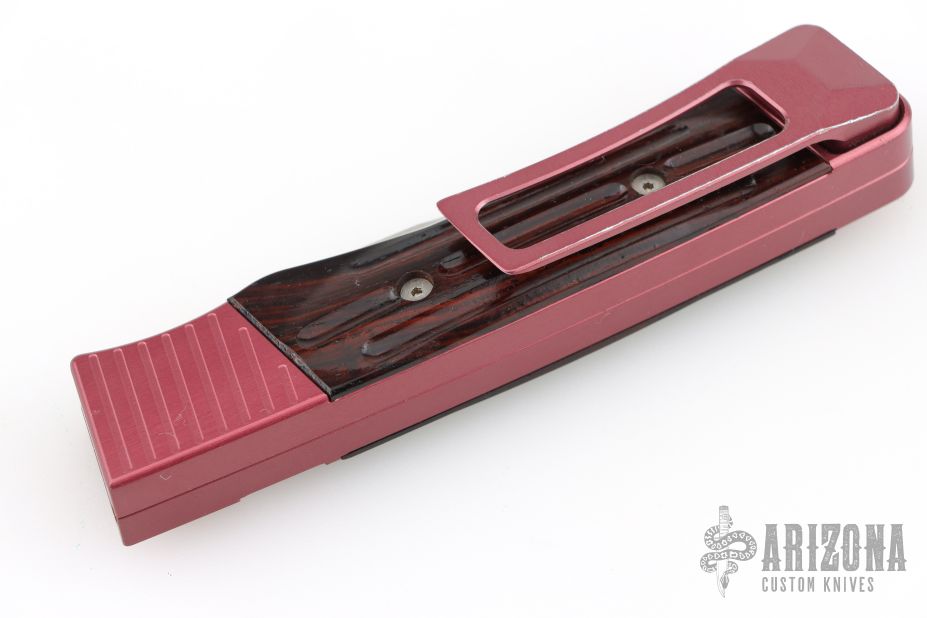 This side opening auto by the James Brothers features a two-tone tanto blade with a notched thumbrest and fullers. The handle features an anodized aluminum frame and pocket clip with wood scales. Strong auto with no blade play. Has a couple light scratches, otherwise excellent condition. Comes with original box and papers.