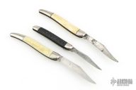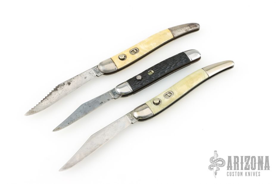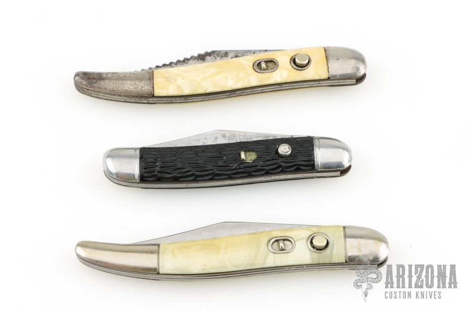 These three autos by Hammer Brand feature clip point blades. The handle as stainless steel bolsters front and rear, acrylic scales, stainless steel liners and backspacers, has safety. Has some patina and scratches, otherwise good condition for their age.