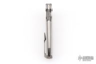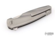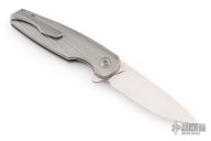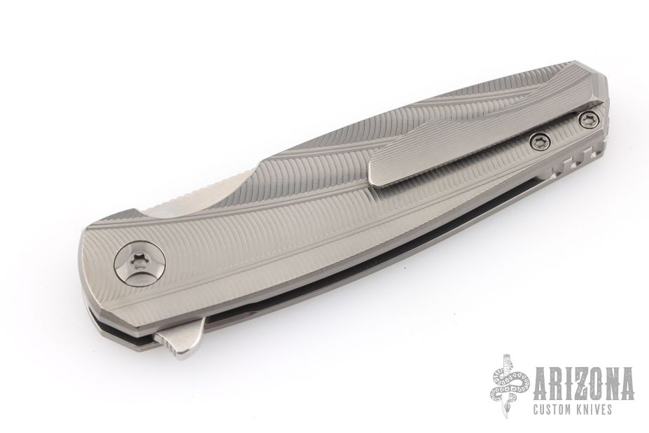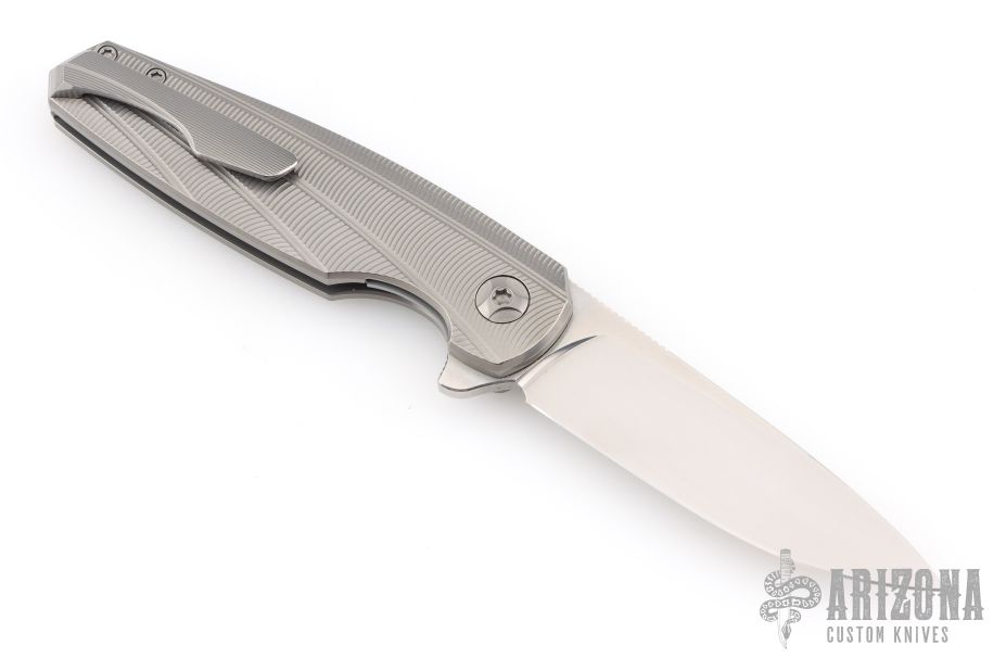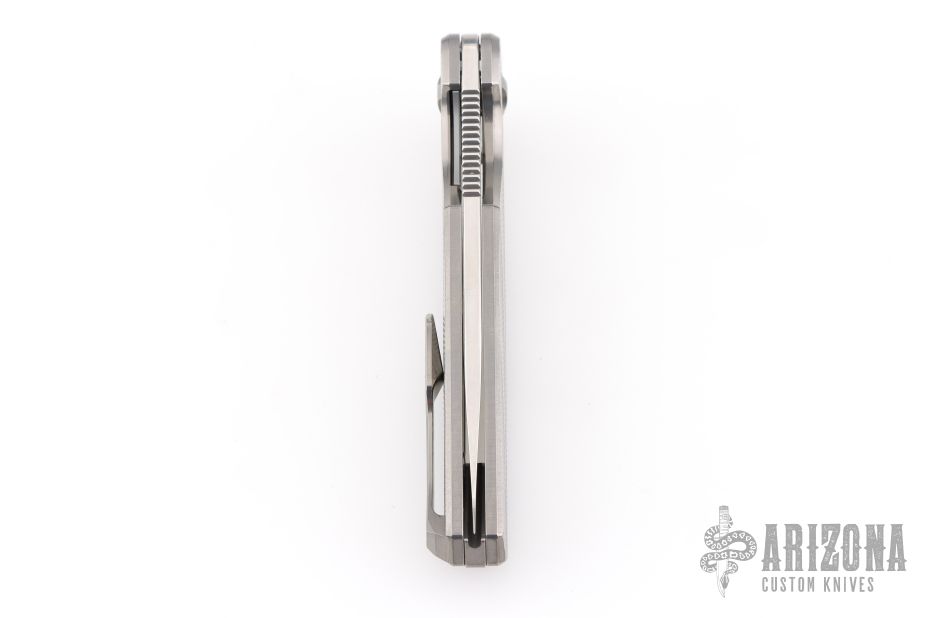 This Morpheus by Holt Bladeworks features a stonewashed blade with a notched thumbrest and flipper tab. The handle features a widow milled titanium frame with nude finish tip up pocket clip and hardware. Nice detent, lock up and blade seating. Includes the original zipper case and COA Selinko card. Excellent condition.