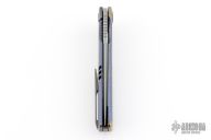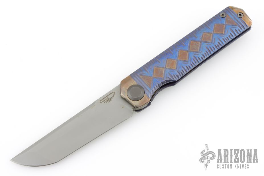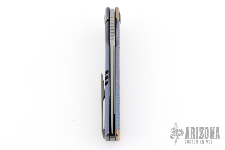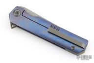 This South Sea w/ Kickstop by Stedemon Knives features a bead blasted blade with kickstop flipper. The handle has a custom carved and anodized titanium frame with black tip up clip and backspacer. Has some oxidation on the blade, has some scratches, otherwise good user condition.