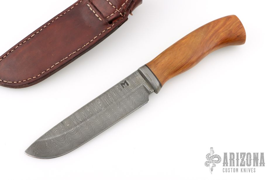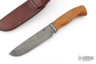 This knife by a Hungarian Knife Maker (please let us know if you recognize this maker) features a Damascus blade with .200" blade stock and 1.506" blade depth, hidden tang construction. The handle has a Damascus guard and wood grip with a black spacer. Comes with a brown leather sheath. Excellent condition.