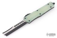 This Combat Troodon by Microtech Knives features a two-tone Hellhound Razor blade with false top edge and notched thumbrest. The handle has a black aluminum frame with a jade G-10 top, tip down black stainless steel clip black hardware. Comes with original box and papers. 03/2023 and S/N 005. Excellent condition.