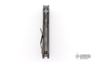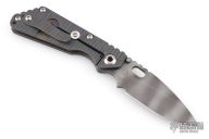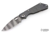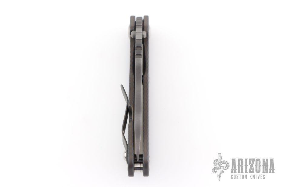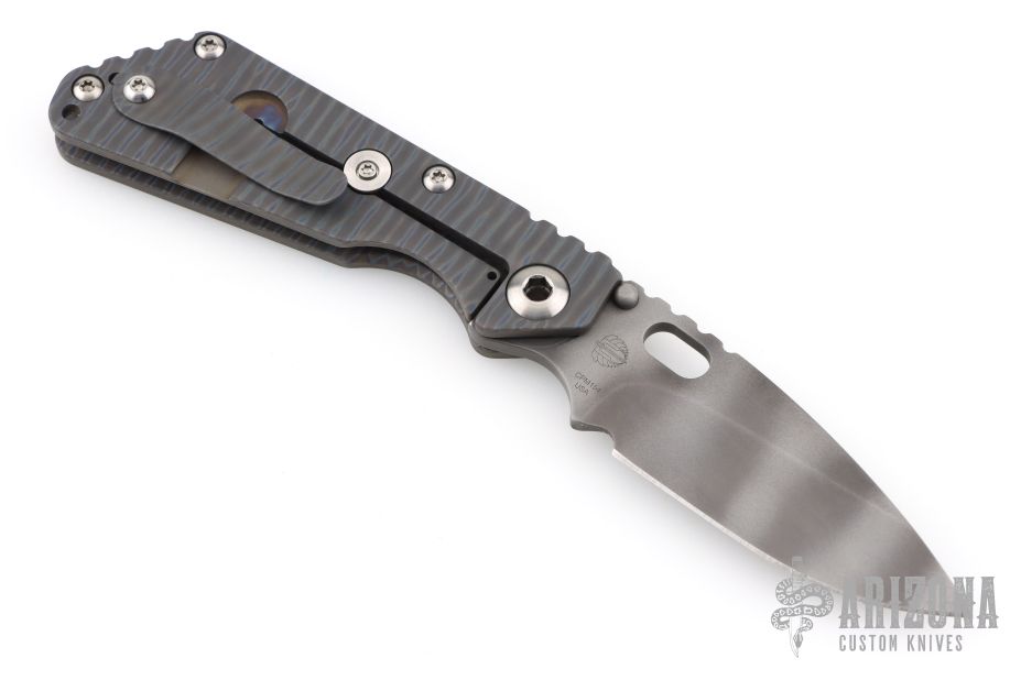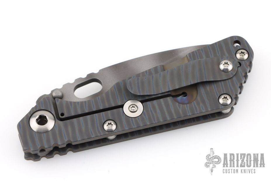 This Mick Strider Performance Series SMF framelock folder features a tiger striped drop point blade with thumbhole and notched thumbrest. The handle has a flamed titanium frame with titanium clip, tip up carry. Jimping on blade spine. Includes Hinderer "Lock Bar Stabilizer" for maximum reverse lock retention. Nice detent, lockup and blade seating. Excellent condition.  Comes with a zippered case.