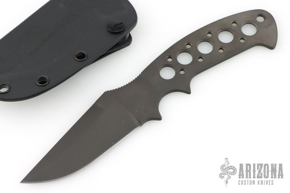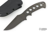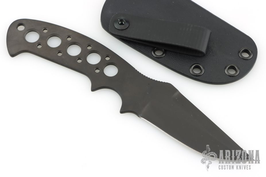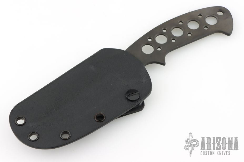 This Kasper Neck Knife from Pat and Wes Crawford features a black DLC finished clip point blade with swedge. Notched thumb rest and deep choil provide a solid grip, .126" blade stock and 1.280" blade depth. Handle has been drilled to reduce weight for ease of carry. Comes with a Kydex sheath, belt clip and ball chain. New from maker!