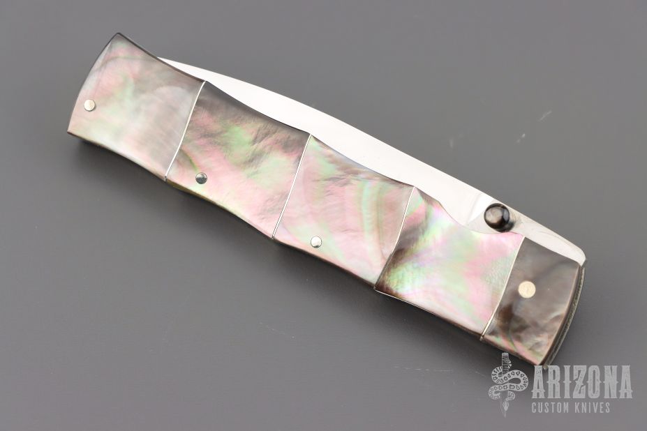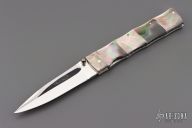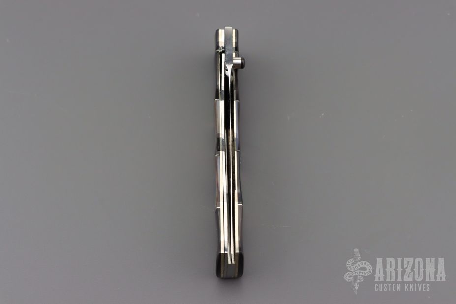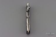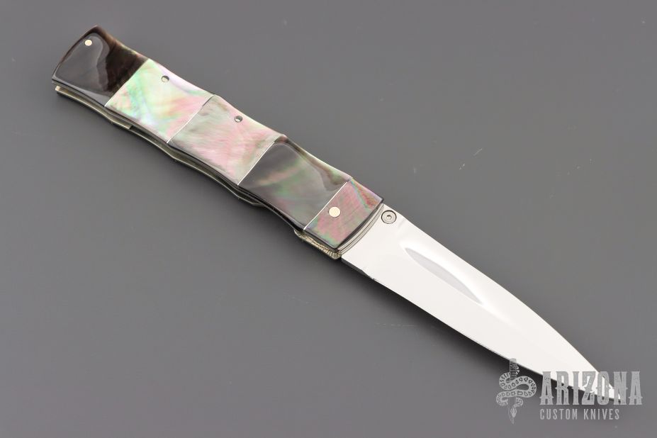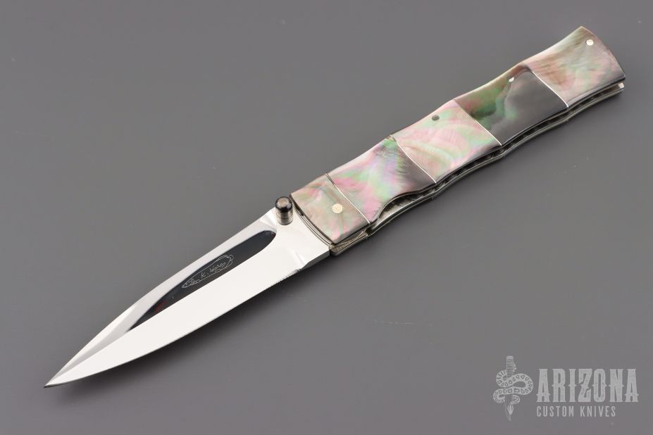 This Dagger Linerlock by Koji Hara features a mirror polished blade with false top edge and a black lip pearl inlaid thumbstud. The handle has black lip pearl with nickel silver spacers/liners, it is sculpted to have the contours of a piece of bamboo, stainless steel backspacer. Beautiful work. Nice blade seating, detent and lock up. Excellent condition. Comes with a zippered case.