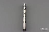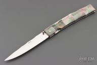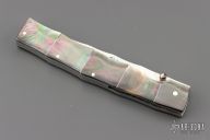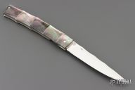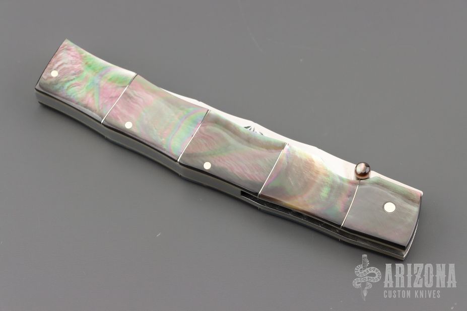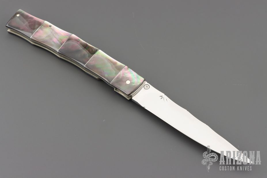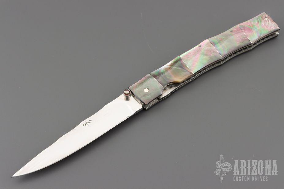 This O'Dake by Koji Hara features a mirror polished blade and a black lip pearl inlaid thumbstud. The handle has black lip pearl with nickel silver spacers/liners, it is sculpted to have the contours of a piece of bamboo. The blade has bamboo leaf carvings and the blade spine is also sculpted to give the piece a bamboo feel from the tip of the blade to the end of the handle. Beautiful work. Great blade seating and lock up. Excellent condition. Comes with a Velcro case.