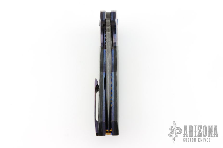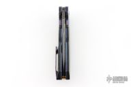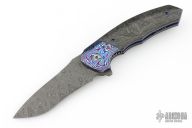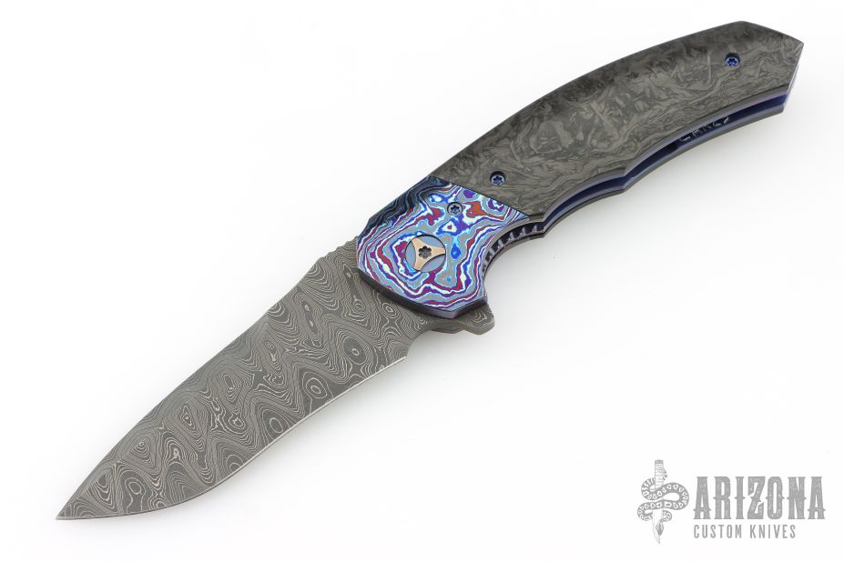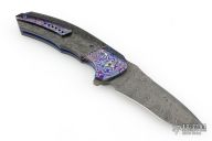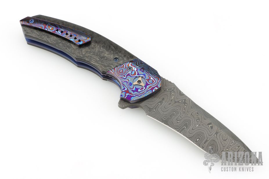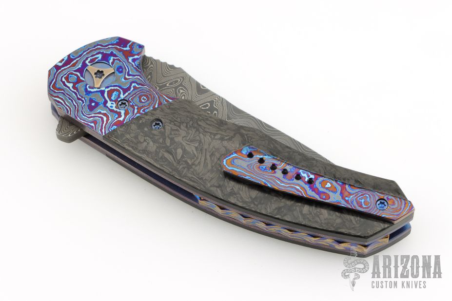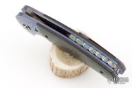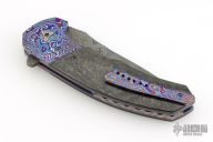 This Tory Linerlock Flipper by Peter Carey features a Mike Norris Stainless Random Damascus blade with notched thumbrest and flipper. The handle has black timascus bolsters, marble carbon fiber scales, anodized and orange peel finished titanium liners, black Timascus tip up clip, MokuTi Dragonspine backstrap. Nice lockup, detent, and seating. Rides on bearings. Very smooth opening action. Comes with zippered case and COA dated 5-4-16. Excellent condition.