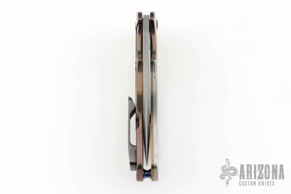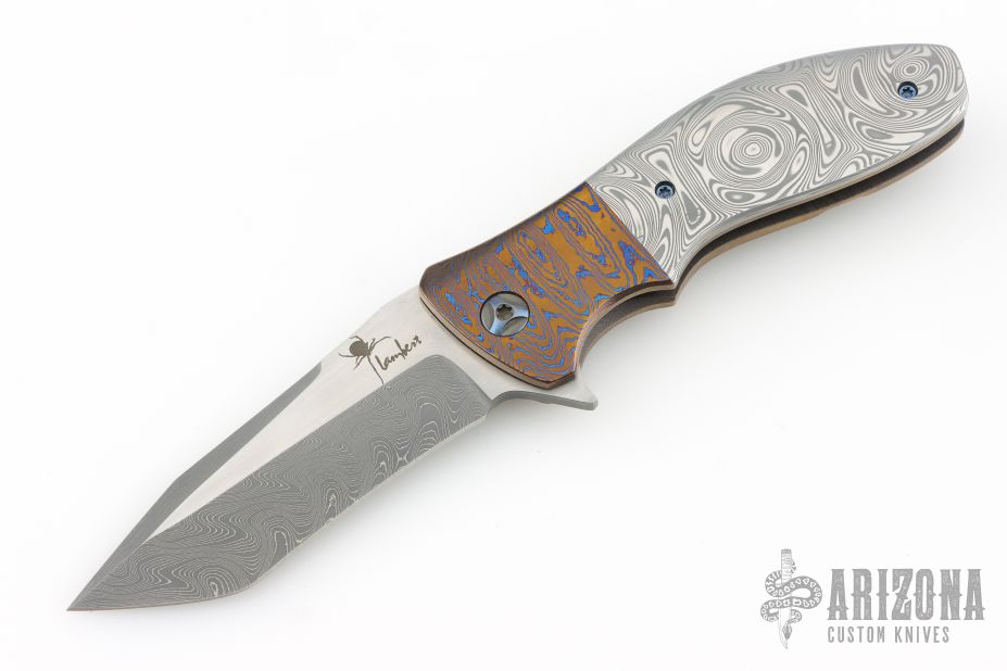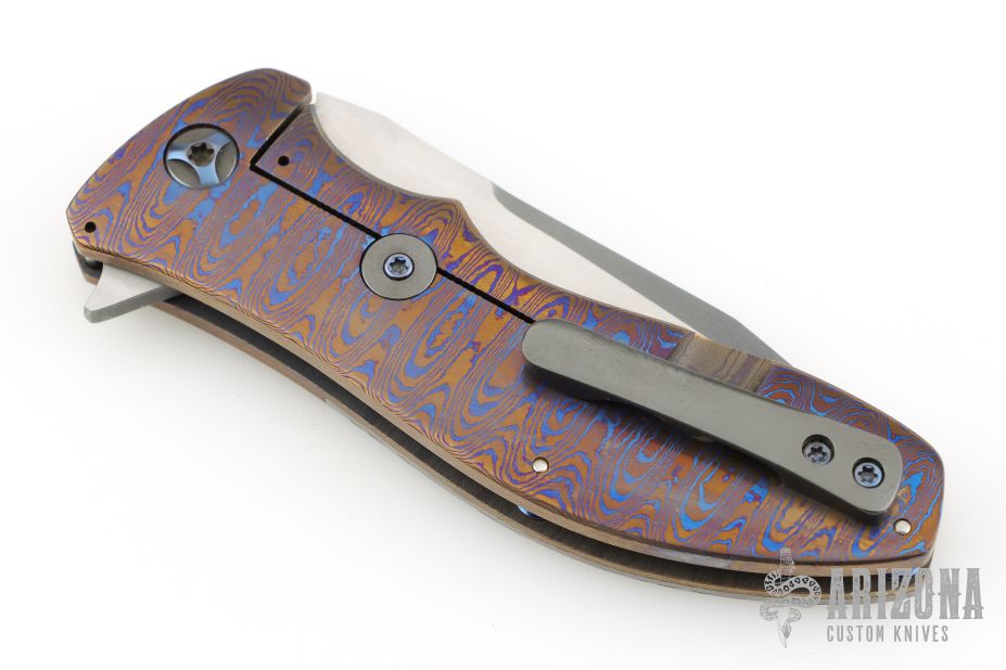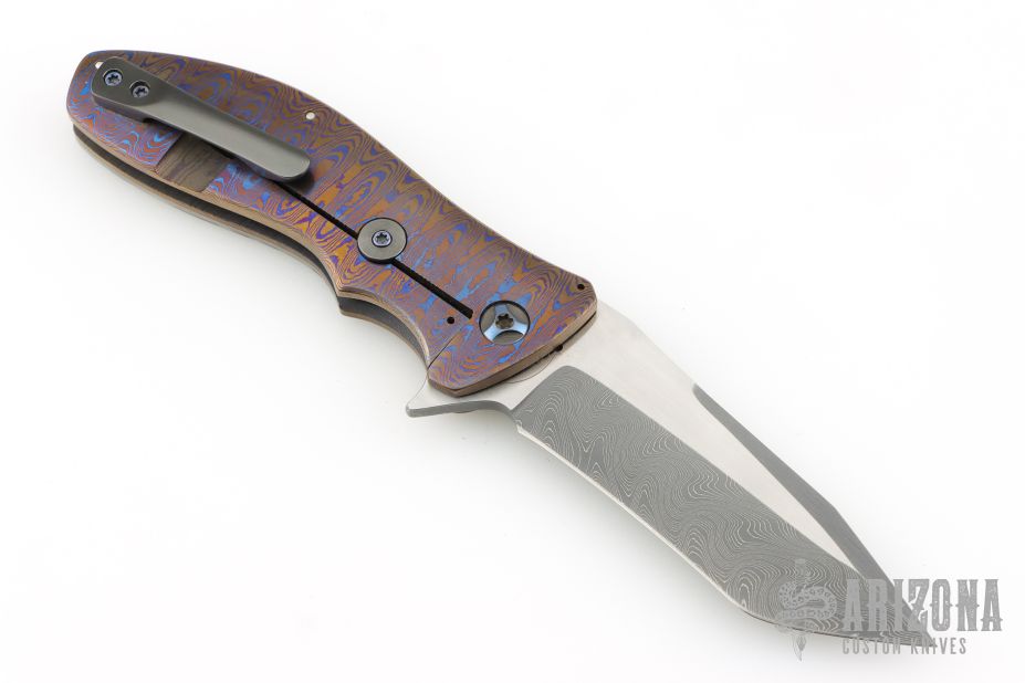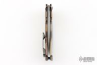 This Lambert Snap Flipper by Kirby Lambert has a Damascus blade with satin flats and flipper. Handle has MokuTi bolster with integral liner, Damasteel scale, MokuTi framelock side, anodized titanium barrel spacers, and a zirconium tip up clip. Comes with a leather zippered case. Nice detent, lockup and blade seating. Has a couple extremely light scratches, otherwise excellent condition.