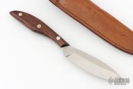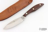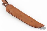 The belt Knife, by Grohmann Knives, features a satin finished stainless steel blade with a notched thumbrest and a full tang construction, .113" Blade Stock and 1.018" Blade Depth. The handle is composed of wood scales. Includes a brown leather sheath. Has a few very light scratches, otherwise excellent condition.