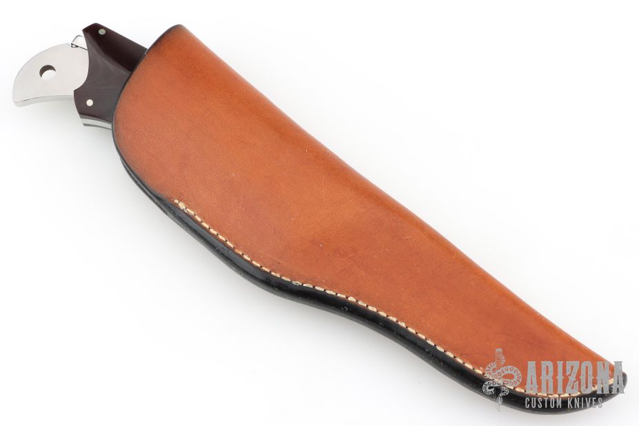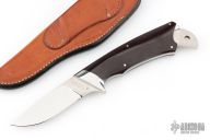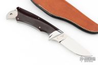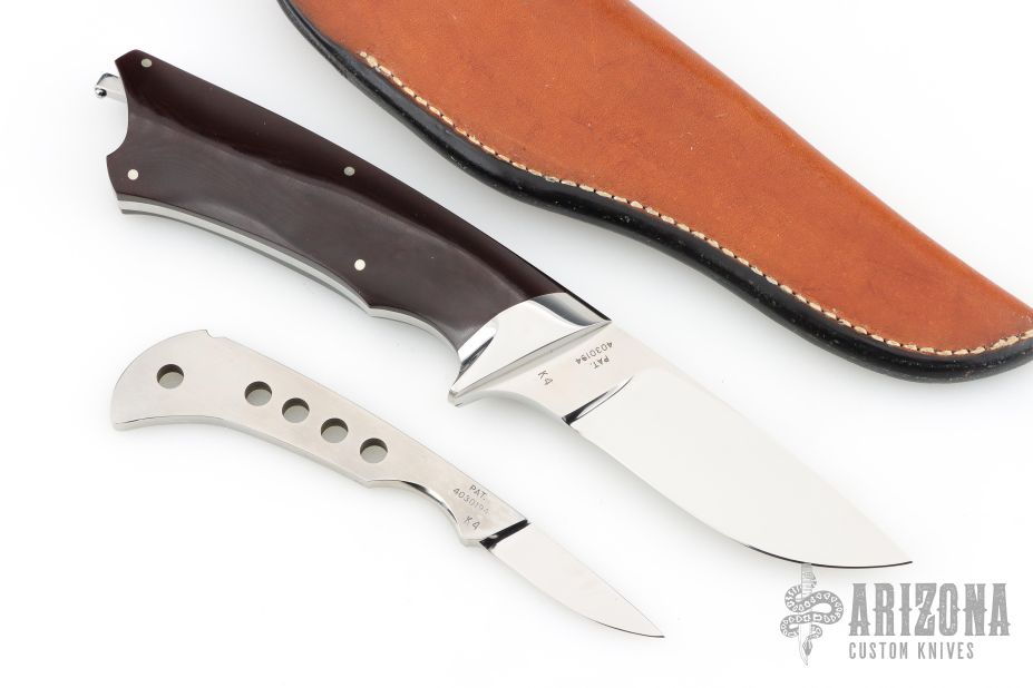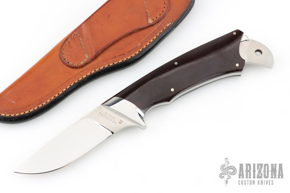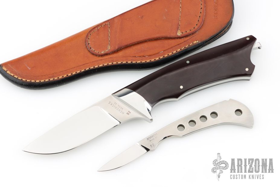 This K4 Kangaroo knife set by Lorenzo Hendricks features a mirror finished blade with .190" blade stock and 1.044" blade depth, full tang construction. The handle has mirror polished and dovetailed stainless steel bolsters, maroon linen micarta scales and nickel silver pins. Knife includes a second blade that fits nicely in rear of handle. Second blade has a mirror finished blade and hand rub satin finished handle. This set is numbered "92" on both blades. Has a few light scratches, otherwise excellent condition. Comes with a brown leather sheath.