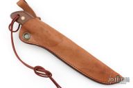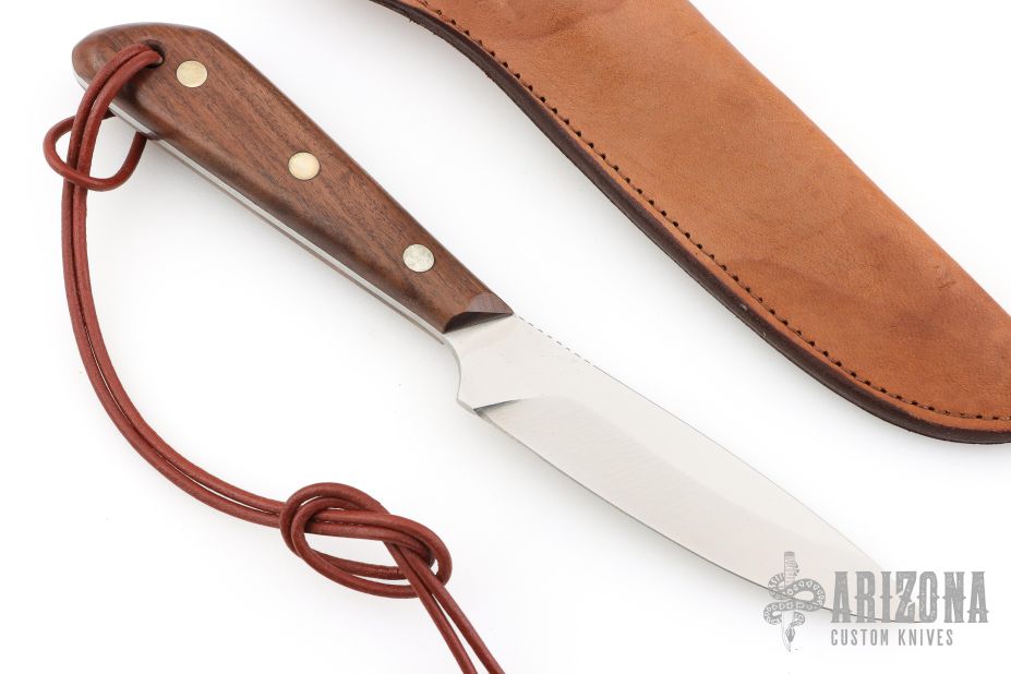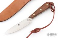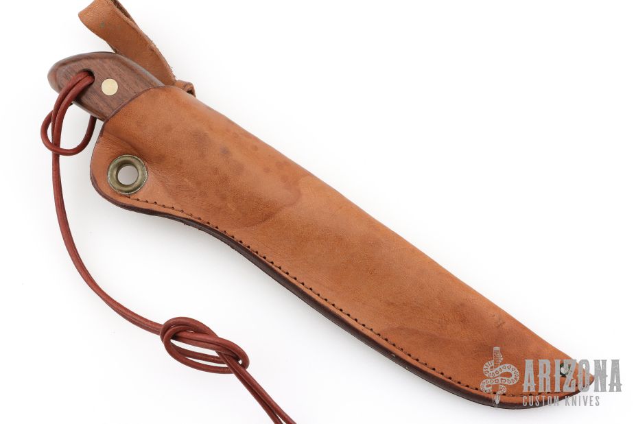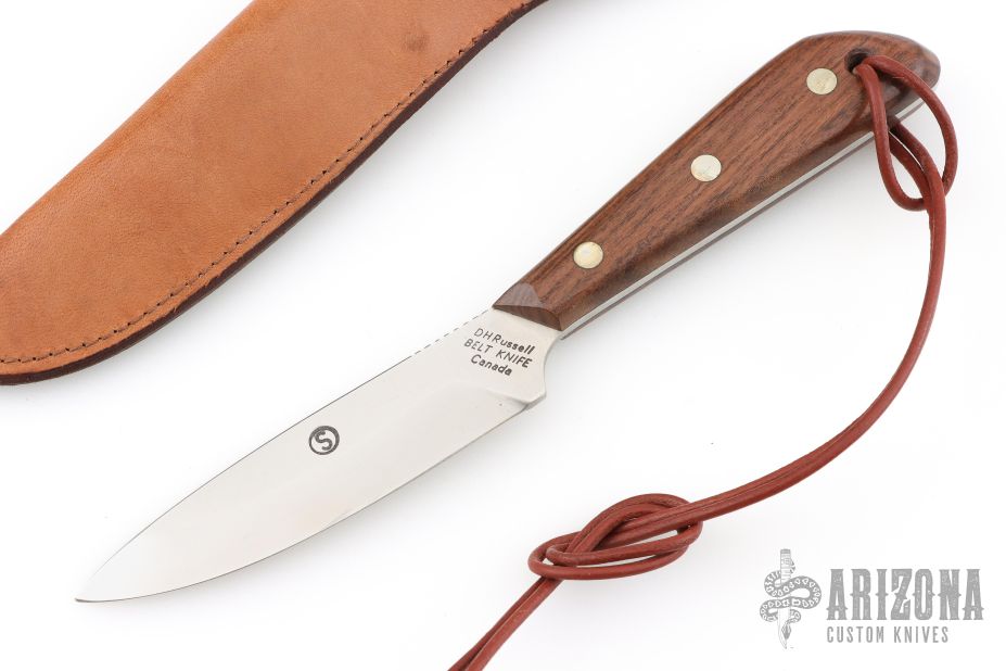 The belt Knife DH Russell features a satin finished stainless steel blade with a notched thumbrest and a full tang construction, .113" Blade Stock and .927" Blade Depth. The handle is composed of wood scales. Includes a brown leather sheath. Has a few very light scratches, otherwise excellent condition.