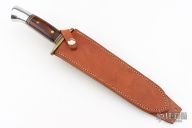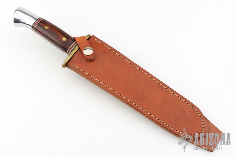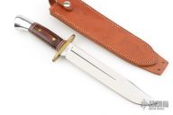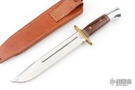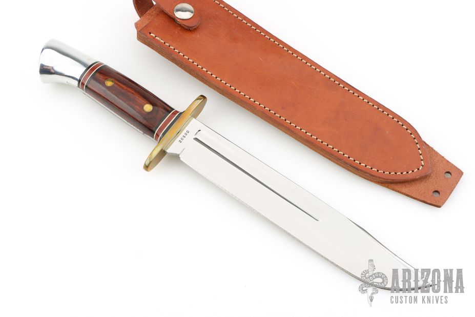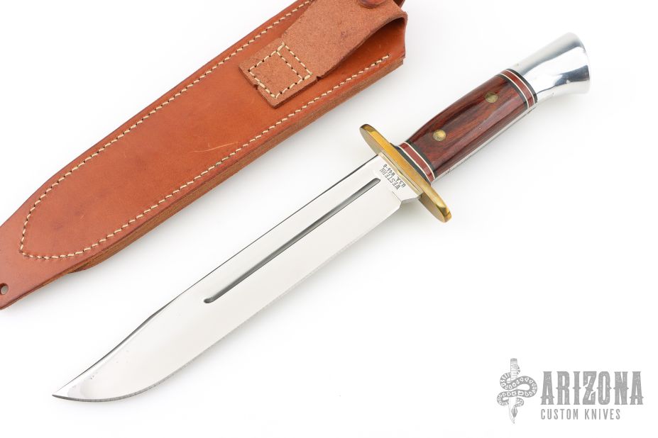 This knife is over 25 years old. Mirror polished bowie blade with fullers, .161" blade stock and 1.241" blade depth, full tang construction. The handle has a brass guard, wood handle with black/white/red spacers and an aluminum butt. Comes with a brown leather sheath. Blade stamped "WESTERN U.S.A.". Has some light scratches and patina, otherwise excellent condition. Comes with original box.