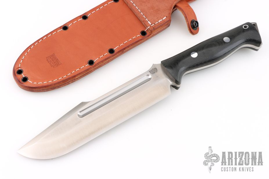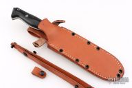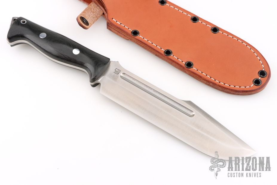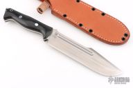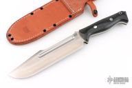 This Tope Recon from Bark River features a satin finished blade with fullers and false top edge, full tang construction with .192" blade thickness and 1.843" blade depth. The handle has black canvas micarta scales with aluminum pins. Comes with a brown leather sheath and original box. This knife has been discontinued. Excellent condition.