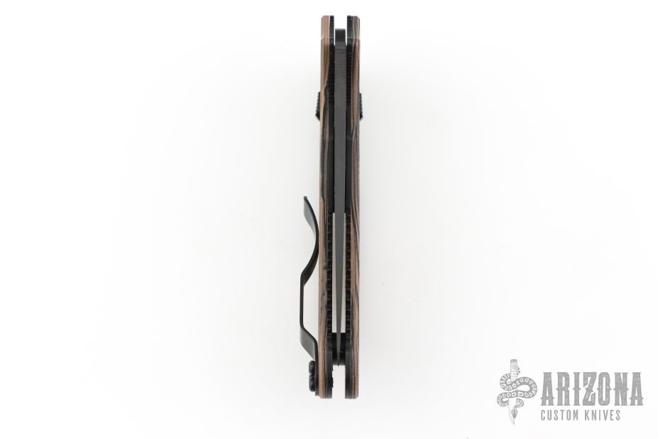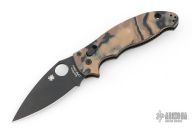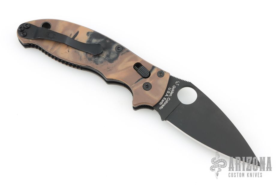This Spyderco Manix 2 is from a sprint run, it has a black blade, thumbhole and notched thumbrest. The handle has black/brown/tan G-10 scales, black stainless steel liners and backspacer, 4-way reversible black stainless steel clip. Includes original box and papers. New condition.