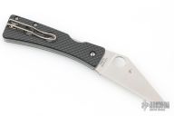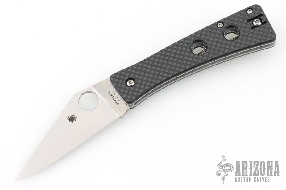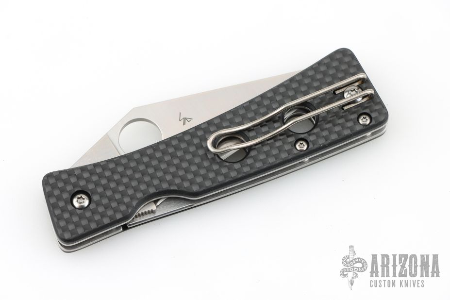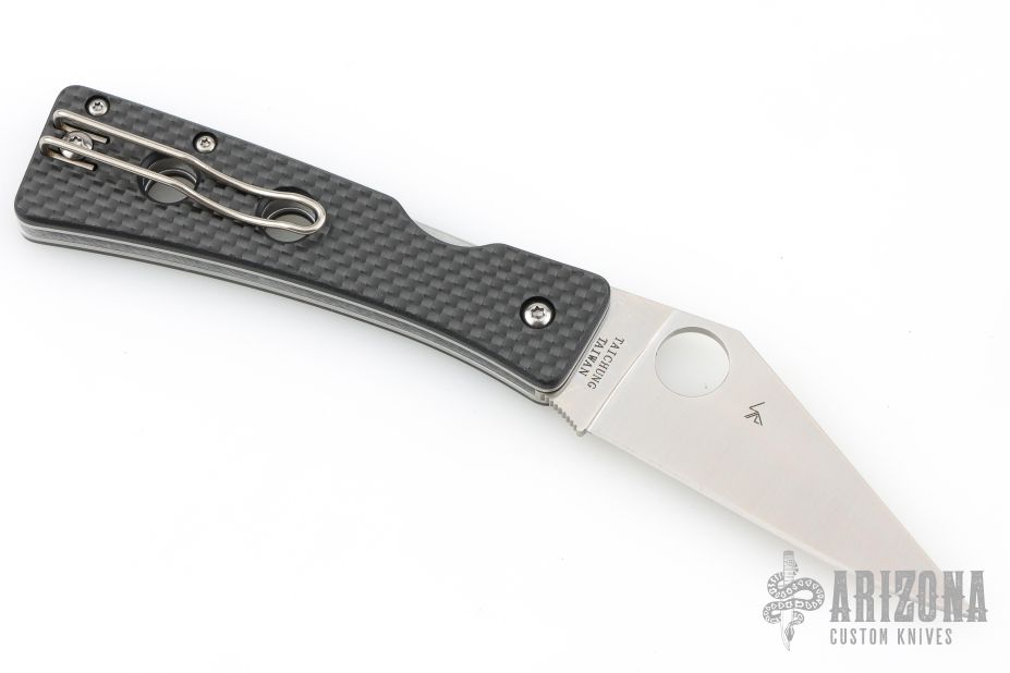 This Watu Pln by Spyderco features a satin finished blade with thumbhole. The handle has carbon fiber scales, stainless steel liners and tip up reversible clip. Comes with original box and papers. New condition.
